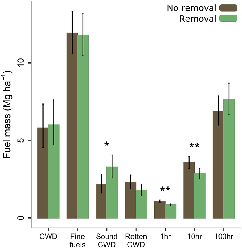 Total mass of coarse woody debris (CWD) did not differ with removal, but sound CWD (decay classes 1–3) mass was 51% higher (p = 0.046) with removal (Figure 4). Total mass of fine fuels (1-, 10-, and 100-h combined) did not differ with removal, but 1-h and 10-h fuels were 21 and 20% lower, respectively, with removal (p = 0.006 and p = 0.004). Litter and duff depth decreased 38 and 51%, respectively, with removal (p > 0.001, p > 0.001), while cover of bare ground increased 15-fold (p > 0.001). Fuel depth also decreased 18% with removal (p = 0.035).