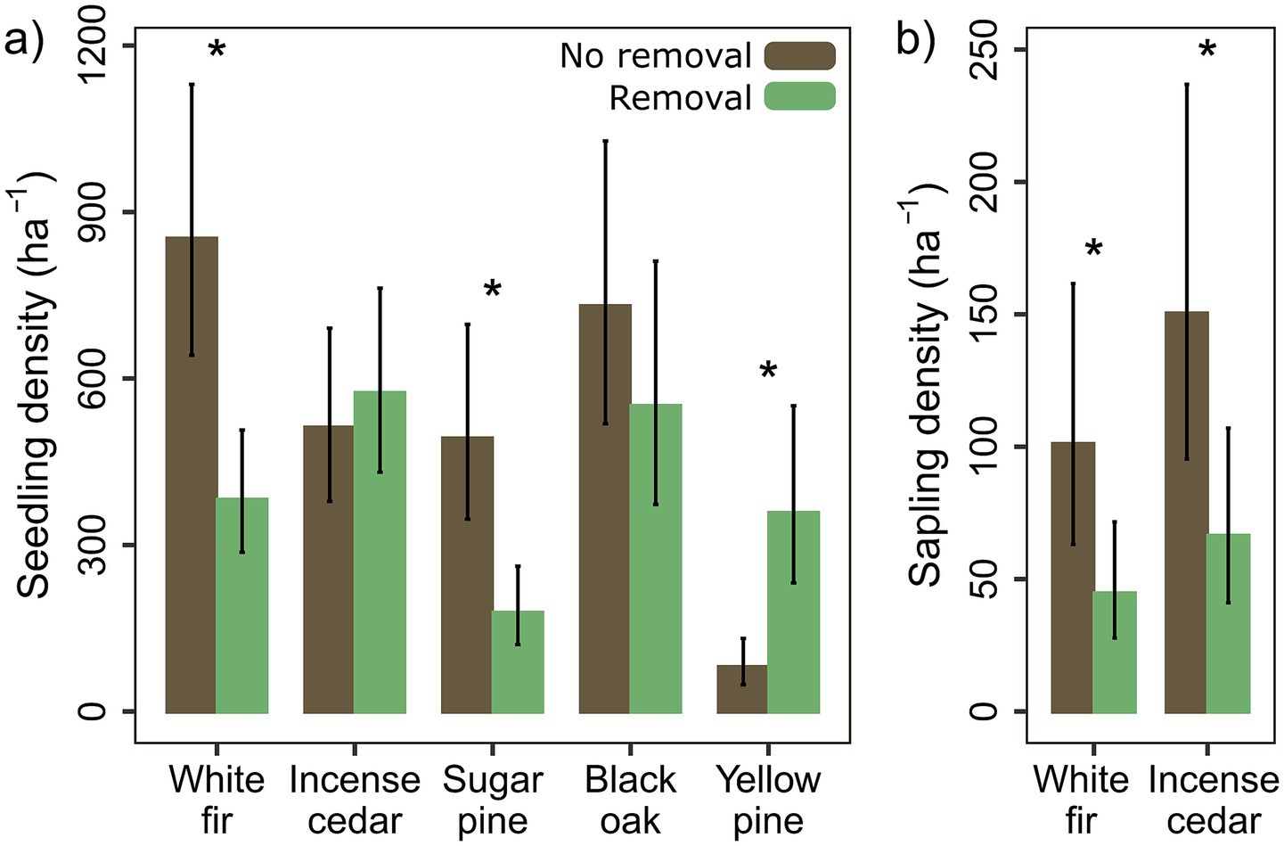 The response of tree seedling density to removal differed by species: white fir and sugar pine seedling density were 55 and 64% lower, respectively, with removal (p = 0.013; p = 0.038), and yellow pine seedling density was 349% higher (p = 0.017) (Figure 5a). Incense cedar and black oak seedling density did not differ with removal. Total tree seedling density did not differ with removal. Sapling density was 56% lower with removal plots (p = 0.025), and the effect of removal on density did not differ by species (Figure 5b). Total seedling density was associated with higher elevations and higher topographic relative moisture index (p > 0.001), our proxy for soil moisture (p = 0.002), while sapling density was associated with higher elevations (p = 0.003).