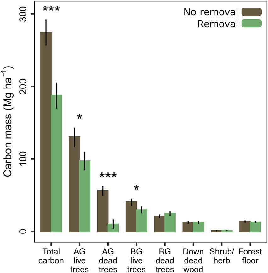 Figure 6. Mean mass of total carbon and carbon within major pools estimated by FVS-FFE. Means and standard errors are calculated from model estimates and standard errors (p < 0.05*, < 0.01**, < 0.001***). AG, aboveground; BG, belowground.