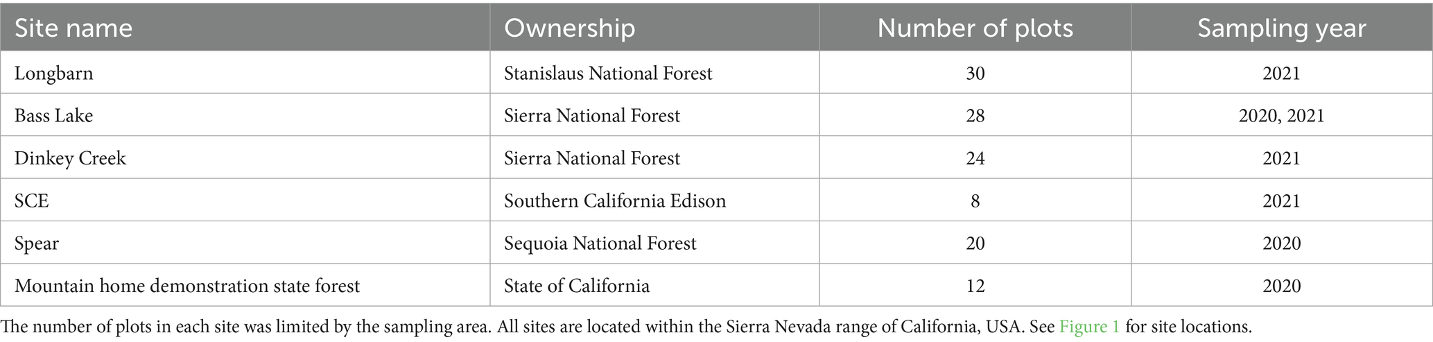 The study was conducted in the central and southern Sierra Nevada of California, USA. The forest type is mixed conifer (North et al., 2016; Safford and Stevens, 2017) and is dominated by white fir (Abies concolor), incense cedar (Calocedrus decurrens), ponderosa pine (Pinus ponderosa), Jeffrey pine (P. jeffreyi), sugar pine (P. lambertiana), and California black oak (Quercus kelloggii). Regional climate is Mediterranean-type, consisting of cold, wet winters and warm, dry summers. The mean annual precipitation of ~1,080 mm falls mostly between November and May, with approximately equal amounts of rain and snow (Minnich, 2007). Plot elevations ranged from 1,190 to 2,295 m. Soils are formed largely from granitic substrates except for approximately half the plots at Longbarn, where soils are derived from weathered glacial deposits. Soils are well-drained to somewhat excessively well-drained and deep to moderately deep (Giger and Schmitt, 1983; Hanes et al., 1996; UC Davis, 2022).