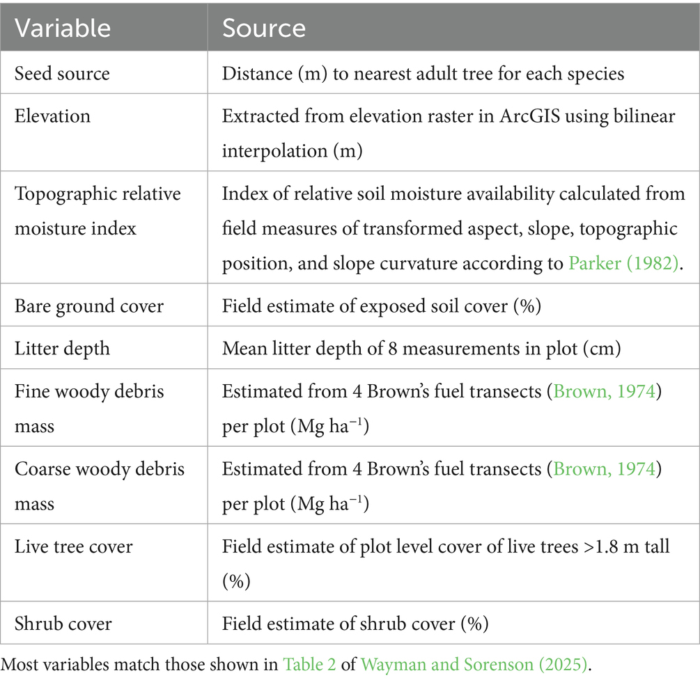 Table 2. Environmental variables tested for associations with changes in conifer regeneration, followed by their definitions and units.