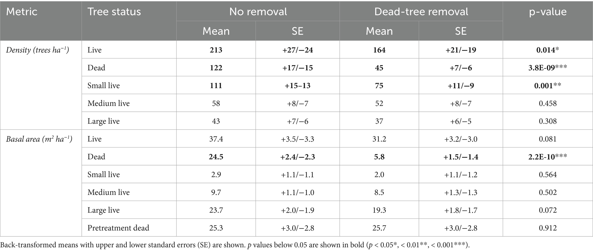 Dead-tree removal, as expected, resulted in a substantial reduction in dead-tree density and dead-tree basal area (Table 3). For live trees, density was modestly lower with removal, while basal area was not affected. Of the live trees, only small trees (7.6–30.0 cm DBH) showed reduced density (Table 3).