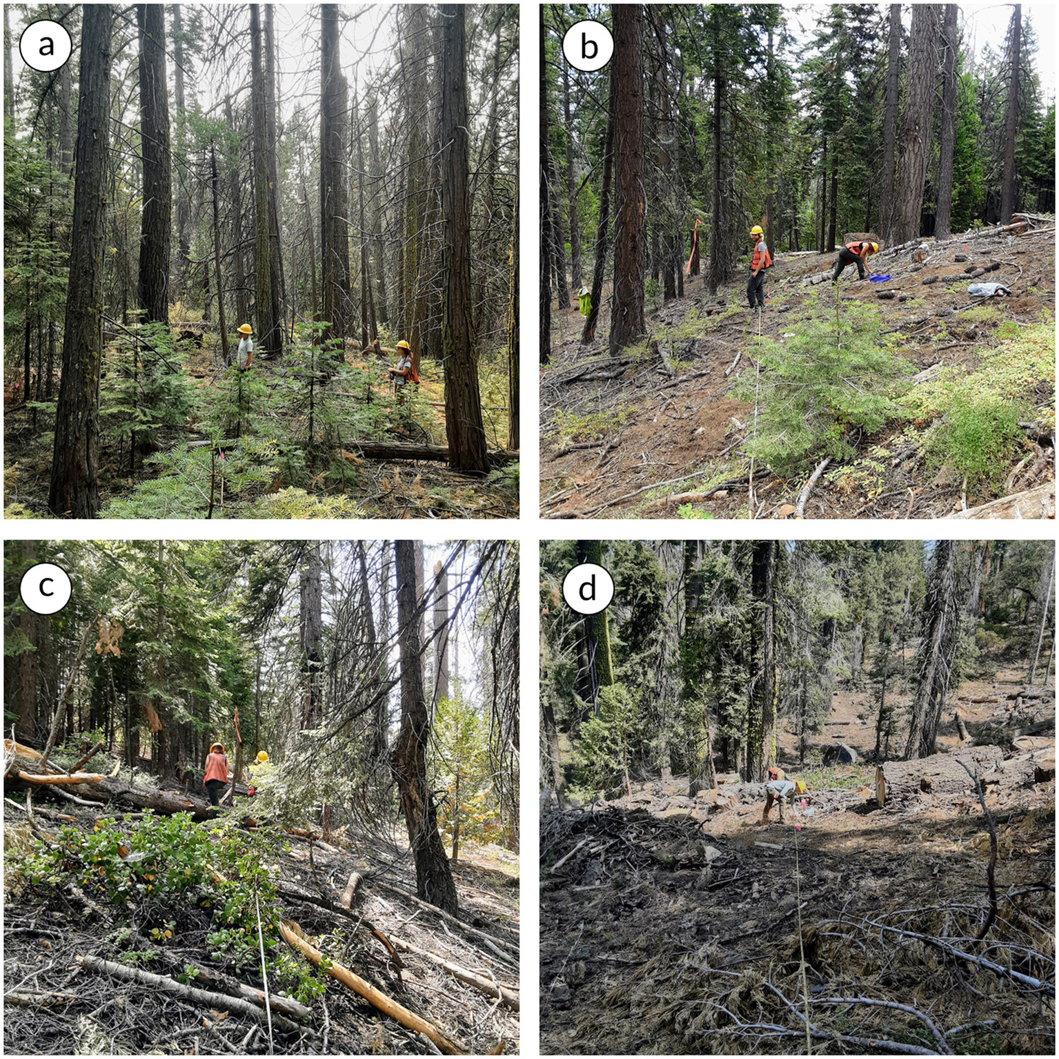 Figure 2. Example photographs of sampling plots where no dead-tree removal occurred (a,c) and where dead-tree removal was performed (b,d) following severe drought- and bark beetle-induced tree mortality (Wayman and Sorenson, 2025). Photo Credits (R. B. Wayman, 2021).