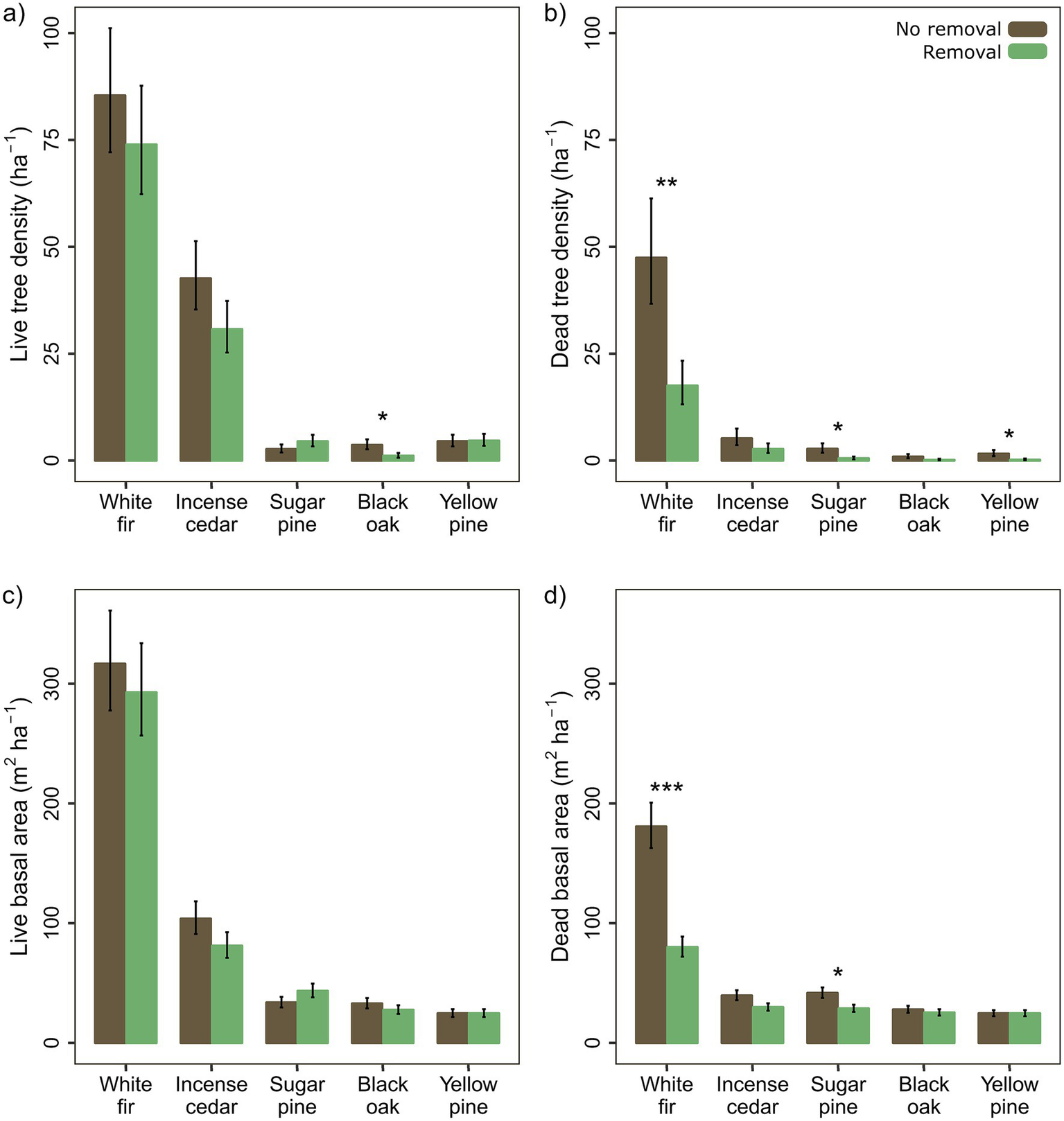 Figure 3. Treatment differences for overstory (>7.6 cm DBH) (a,b) tree density and (c,d) basal area for (a,c) live and (b,d) dead trees of the five most common tree species: white fir (Abies concolor), incense cedar (Calocedrus decurrens), sugar pine (Pinus lambertiana), California black oak (Quercus kelloggii), and yellow pines (P. jeffreyi and P. ponderosa). Means and standard errors are calculated from back-transformed model estimates and standard errors and were scaled to be per hectare based on the 0.0405 ha plot area (p < 0.05*, < 0.01**, < 0.001***).