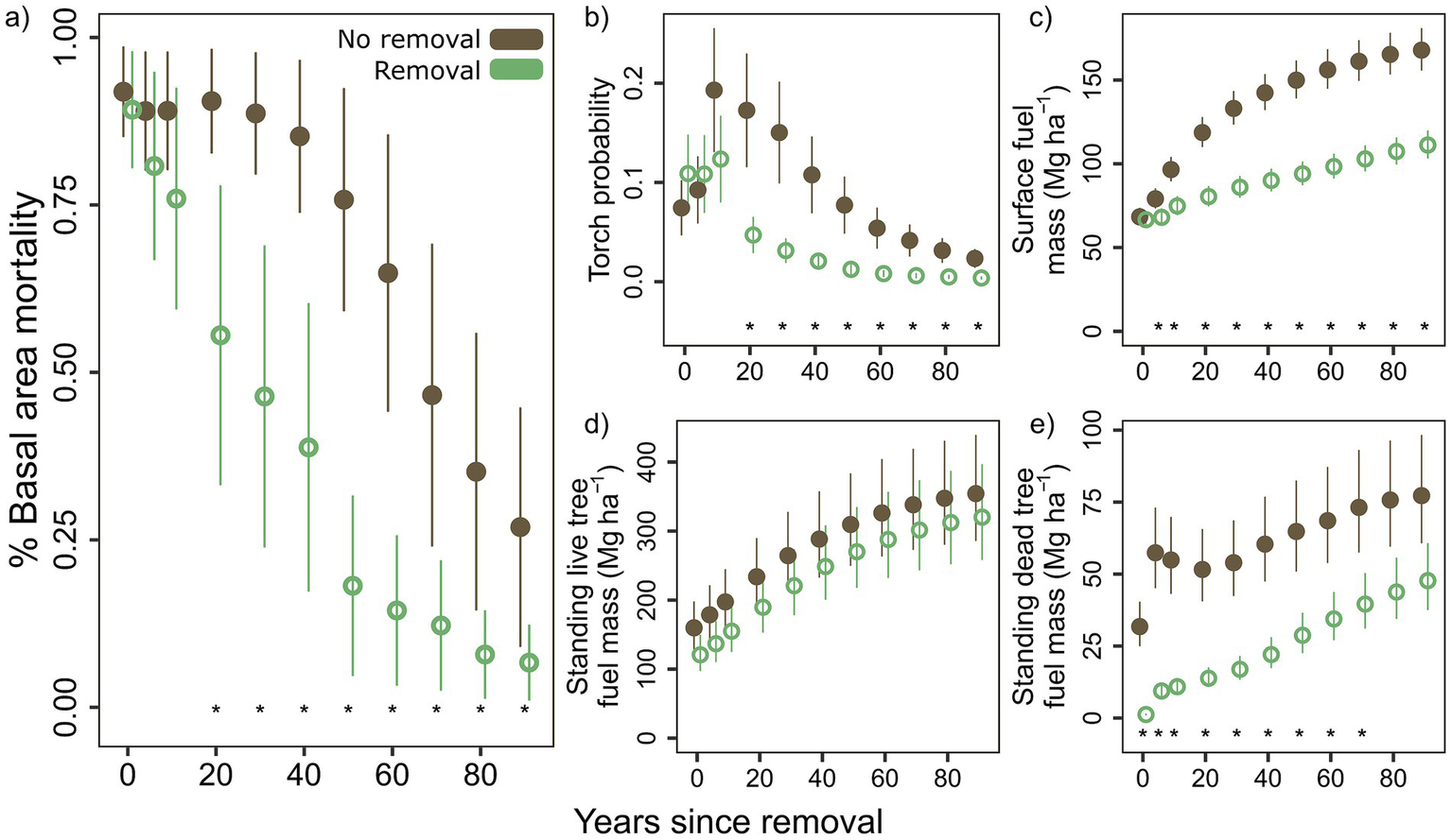 Figure 7. Changes in (a) post-fire percent basal area mortality, (b) torch probability, (c) surface fuel mass, (d) standing live tree fuel mass, and (e) standing dead tree fuel mass simulated by the Forest Vegetation Simulator with the Fire and Fuels Extension in decadal increments over 90 years. Percent basal area mortality (a) and torch probability (b) assume an average wildfire occurring in that year. Means and standard errors are calculated from back-transformed model estimates and standard errors (p < 0.05*).