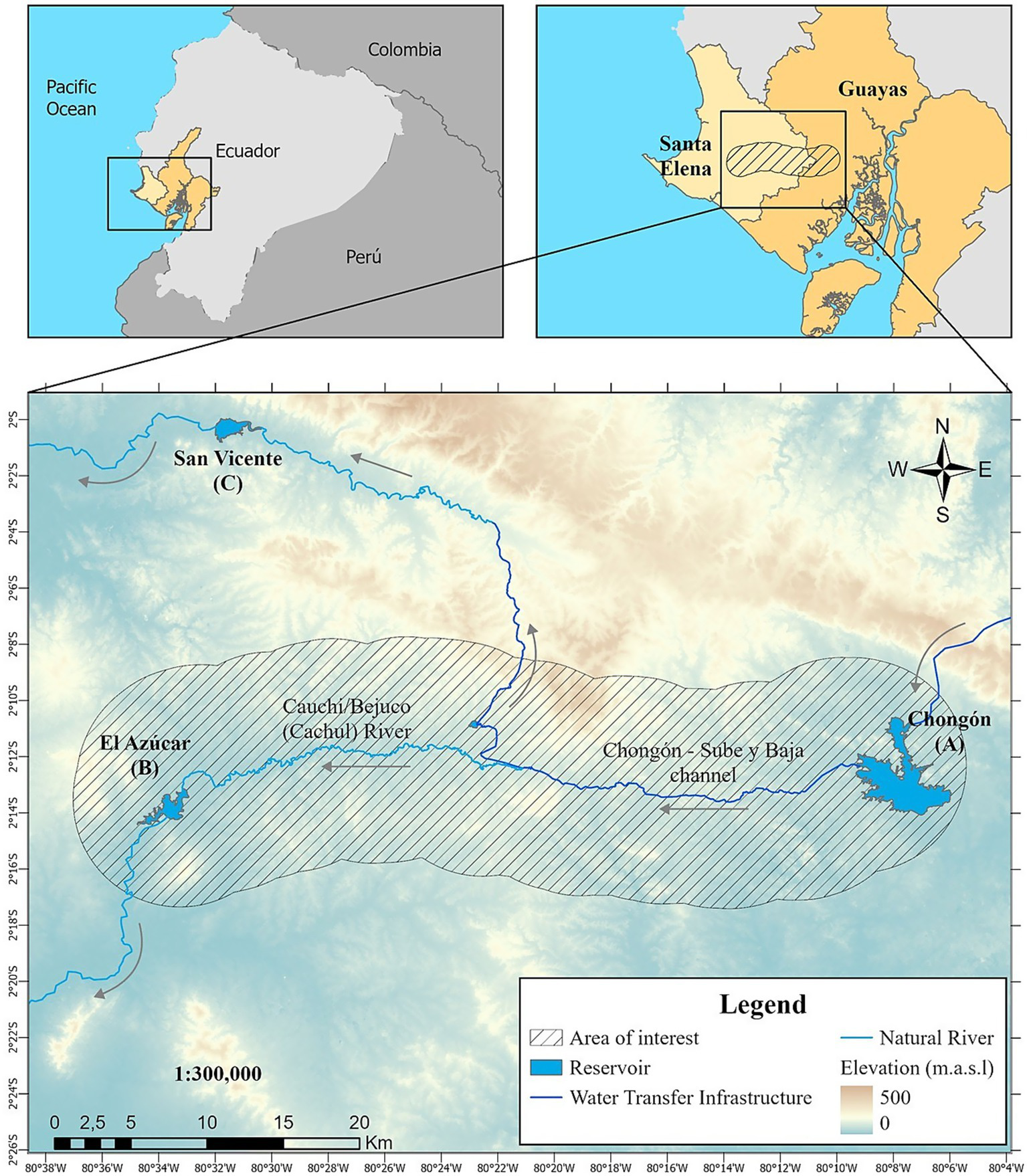 Ecuador’s TDFs are distributed along the coast from southern Esmeraldas to the Gulf of Guayaquil, with clusters in Manabí, Santa Elena, Guayas, El Oro, and Loja (Schipper, 2020). These ecosystems are highly biodiverse but severely threatened, home to approximately 900 species, of which 18% are endemic, while only 13% of their area is under protection (Escribano-Avila et al., 2017; Rivas et al., 2020). Deforestation between 1990 and 2018 resulted in a 27.04% loss of the original extent (Rivas et al., 2021). In the Inter-Andean Dry Forest, a 45% loss was recorded between 1991 and 2017, mainly due to agricultural expansion (Rodríguez-Echeverry, 2023). Fragmentation has generated a landscape of small, isolated patches that increase edge effects, reduce connectivity and gene flow, and negatively affect biodiversity (Rivas et al., 2021; Rodríguez-Echeverry and Leiton, 2021). An estimated 62 endemic woody species are threatened, and 69% of them are not found in protected areas, while human activities such as grazing and selective logging further alter forest structure and biodiversity (Romero-Saritama, 2018; Benítez et al., 2024). In addition, soil degradation has impaired soil functionality, reducing the ecosystem’s capacity to support essential ecological processes (de Sosa et al., 2024). These impacts interact with climate change, contributing to the decline of suitable habitat for several tree species (Aguirre et al., 2017). In this context, any new driver of land-use change, such as large-scale Inter Basin Water Transfer (IBWT) schemes, may further erode the remaining TDF remnants and compromise their long-term persistence in Ecuador.