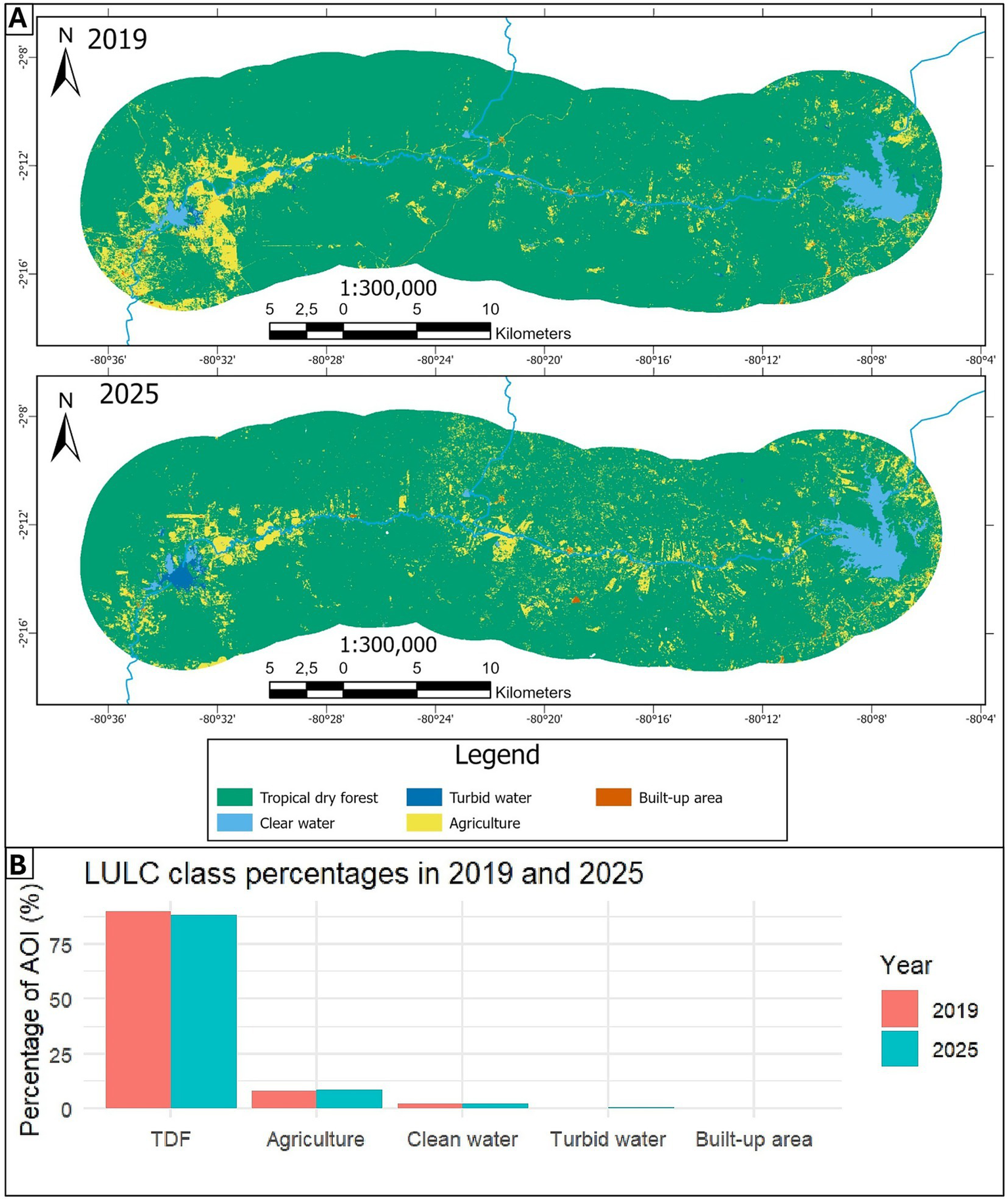 In this context, this study aims to characterize land-use and land-cover dynamics in the tropical dry forests influenced by the Chongón–El Azúcar water-transfer system. Specifically, we (i) map LULC classes for 2019 and 2025 using Sentinel-2 time series, spatial analysis, and supervised classification with the Random Forest (RF) algorithm; (ii) quantify net and gross land-cover transitions, with emphasis on TDF losses and gains; and (iii) identify which anthropogenic land uses, particularly agriculture and built-up areas, are replacing TDF and where these changes are concentrated within the canal and reservoir influence zone, where irrigation water availability is highest. The resulting LULC products and change analyses provide local decision-makers with an operational basis for monitoring the conservation status of tropical dry forests, regulating the expansion of water-dependent agricultural and industrial activities, and supporting land-use planning, including the designation of priority areas for the conservation of endemic-rich TDF remnants and the sustainable development of their ecotourism potential.