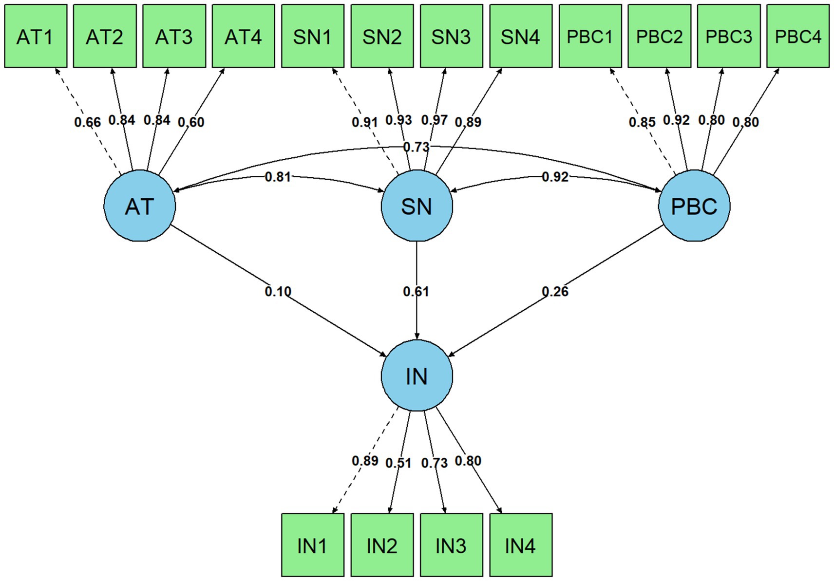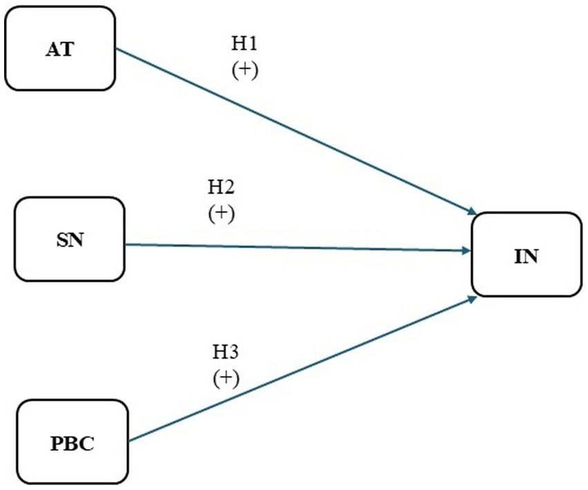 A baseline covariance-based structural equation model (CB-SEM) was specified, incorporating the three core TPB constructs (AT, SN, and PBC) as predictors of intention (IN). Structural equation analyses were performed in R (v. 3.6.3) using the lavaan package (Rosseel, 2012).