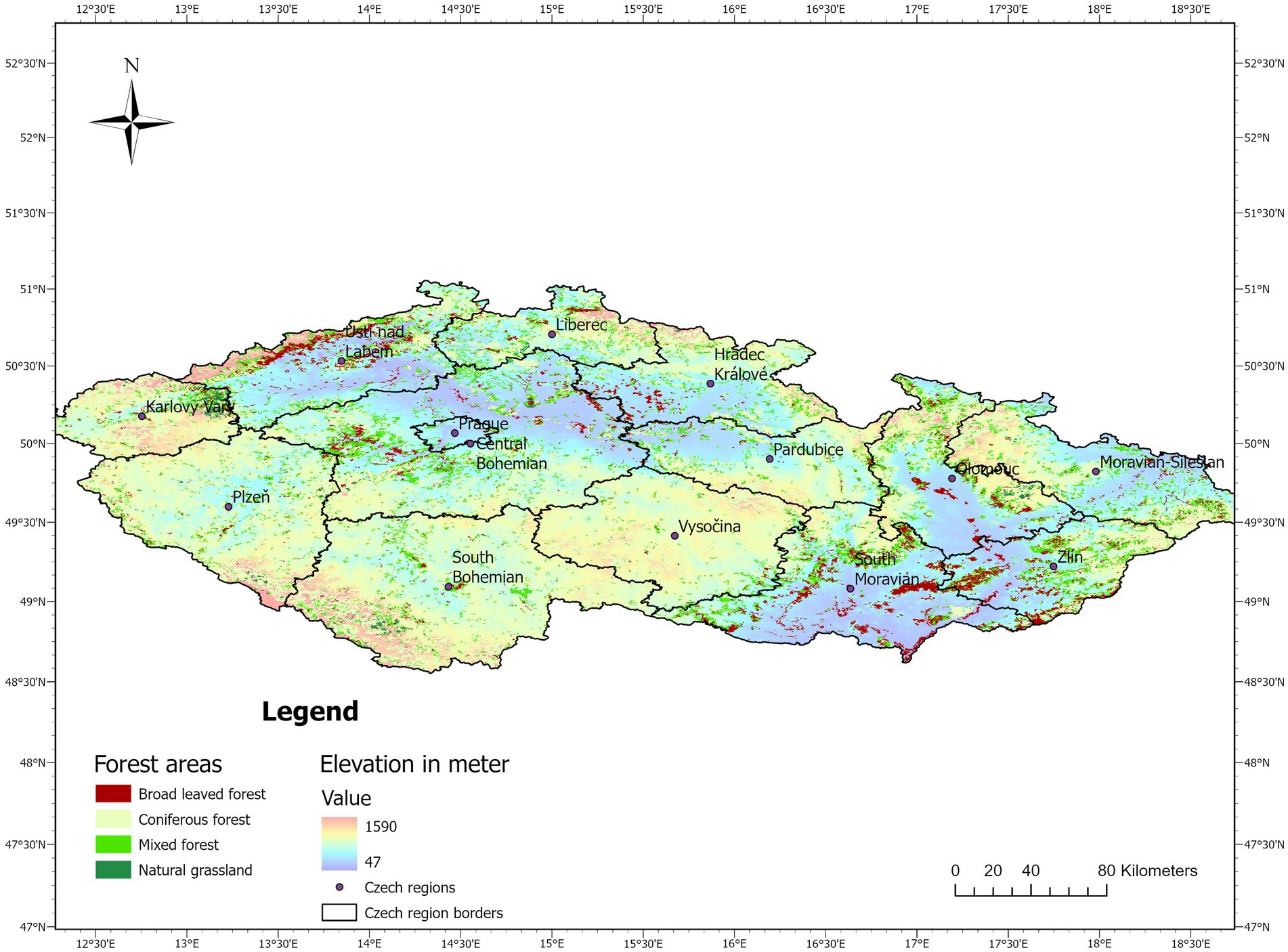 The Czech Republic, located in Central Europe, covers 78,866 km2 and is divided into 14 administrative regions that broadly correspond to the historical territories of Bohemia, Moravia, and Silesia (Forest Europe, 2020). Approximately one-third of the country is forested, with regional variations in forest composition: Bohemia is dominated by spruce–pine stands, Moravia features mixed oak–beech–spruce forests with strong municipal management, and Silesia combines Beskid Mountain woodlands with industrial lowlands undergoing ecological restoration (Šišák et al., 2016). The nation’s vegetation includes beech–fir forests at mid elevations, broad-leaved oak woodlands in lowlands, and coniferous spruce forests at higher altitudes (Figure 2). The Czech Republic experiences a temperate climate influenced by both oceanic and continental patterns, shaped by prevailing westerly winds and frequent cyclonic activity. Summers are generally mild and dry, averaging 20 °C, while winters are wetter with temperatures approximately 0 °C; relative humidity typically ranges from 60 to 80% (Tolasz et al., 2007). The average elevation is approximately 430 m above sea level, with the highest point being Sněžka (1,603 m) and the lowest near Hřensko (115 m) (Chytrý, 2017).