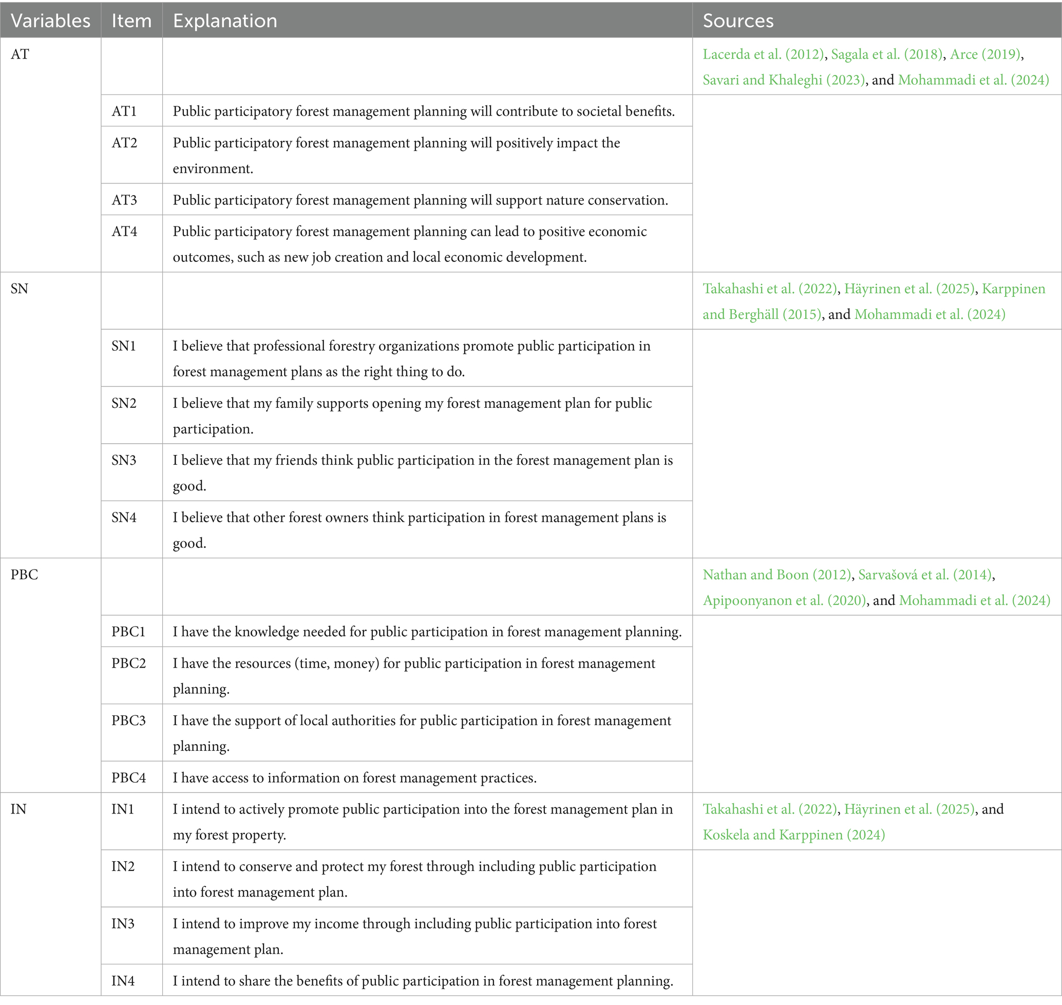 SN plays a crucial role in shaping individuals’ behaviors by defining what is perceived as socially appropriate or acceptable within a given context (Wenzel and Woodyatt, 2025). This construct captures the extent to which an individual’s intention to perform a behavior is influenced by the approval or disapproval of significant others or relevant social groups (Ajzen, 1991). Individuals often act according to their perceptions of others’ expectations, and their intentions are strongly guided by the opinions of those they consider important. SN represents a powerful form of social influence, as it reflects collective expectations and reinforces dominant practices while discouraging alternatives (Mortensen et al., 2019). Empirical research shows that appeals to social norms can effectively foster sustainable and pro-environmental behaviors by aligning personal decisions with perceived collective expectations (Schorn, 2024). Within the TPB, behavioral intentions are shaped by SN arising from the perceived expectations of significant referents such as family members, peers, or professional networks (Ajzen and Fishbein, 1975). In the context of forest management, multiple studies confirm that social norms are a key determinant of landowners’ intentions. For example, Koskela and Karppinen (2024) found that peer pressure influenced Finnish forest owners’ willingness to protect biodiversity, while Holt et al. (2021) showed that U. S. landowners were guided by professional networks when responding to invasive pests. Similarly, Lima and Bastos (2020) and Ma et al. (2012) demonstrated that community and institutional expectations significantly shaped landowners’ decisions, underscoring the central role of social norms in driving forest-related behavior.