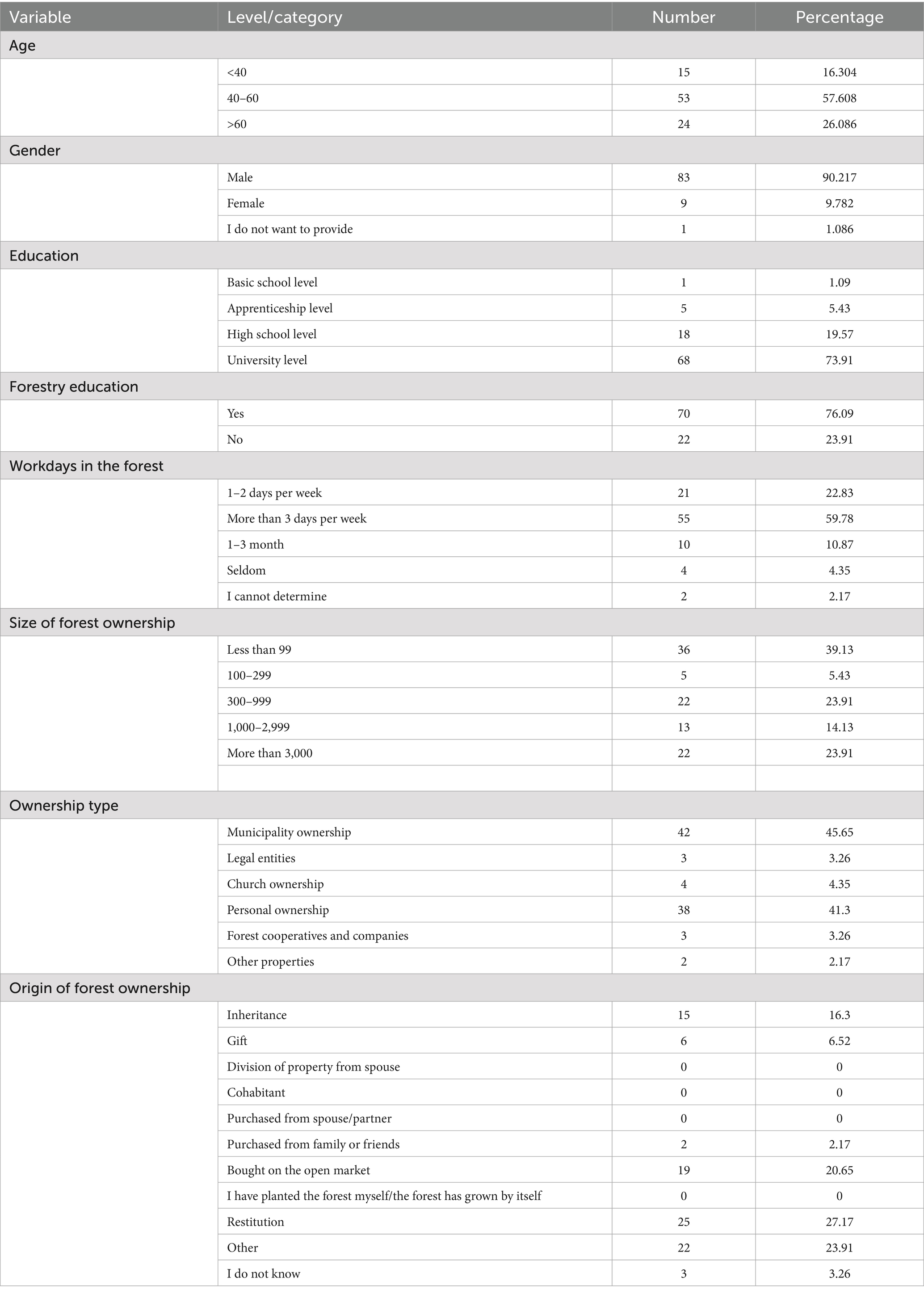 The respondents were predominantly male (90%) and middle-aged (58% between 40 and 60 years). The majority of the respondents held a university degree (74%) and had formal forestry education (76%). The majority of the respondents reported being actively engaged in forest work, with nearly 60% spending more than 3 days per week in the forest. Forest ownership was diverse, with small holdings (<99 ha; 39%) and very large holdings (>3,000 ha; 24%) being the most common. Municipality (46%) and personal ownership (41%) represented the dominant ownership types. Regarding origin, restitution (27%), market purchase (21%), and inheritance (16%) were the leading forms of acquisition. This diverse profile provided a solid foundation for analyzing forest owners’ intentions toward public participation in management planning (Table 2).