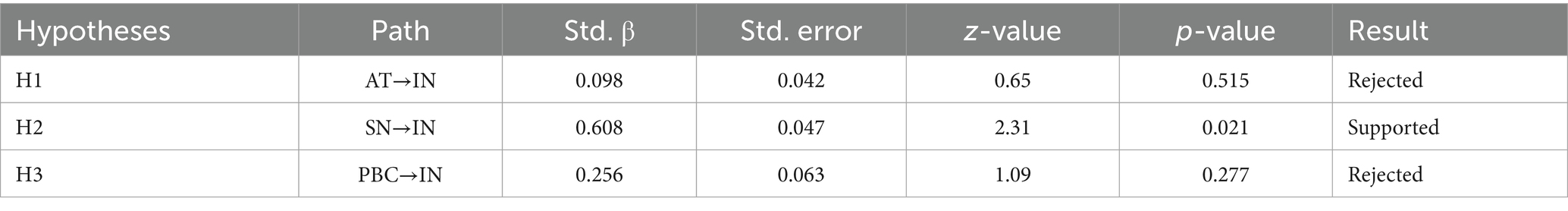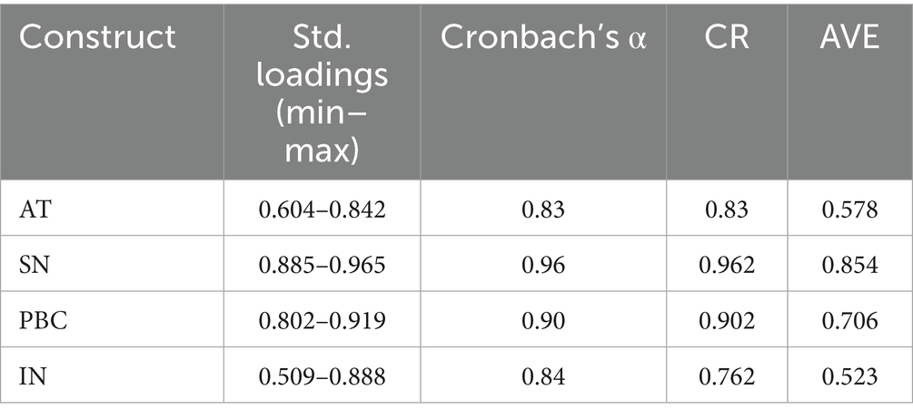 To assess the internal consistency of the measurement scales, Cronbach’s alpha was calculated for each construct. The results showed high reliability across all constructs: AT (α = 0.83), SN (α = 0.96), PBC (α = 0.90), and IN (α = 0.84). The CR values were also satisfactory (>0.70), and the AVE exceeded the recommended threshold of 0.50, indicating good convergent validity (Table 3).