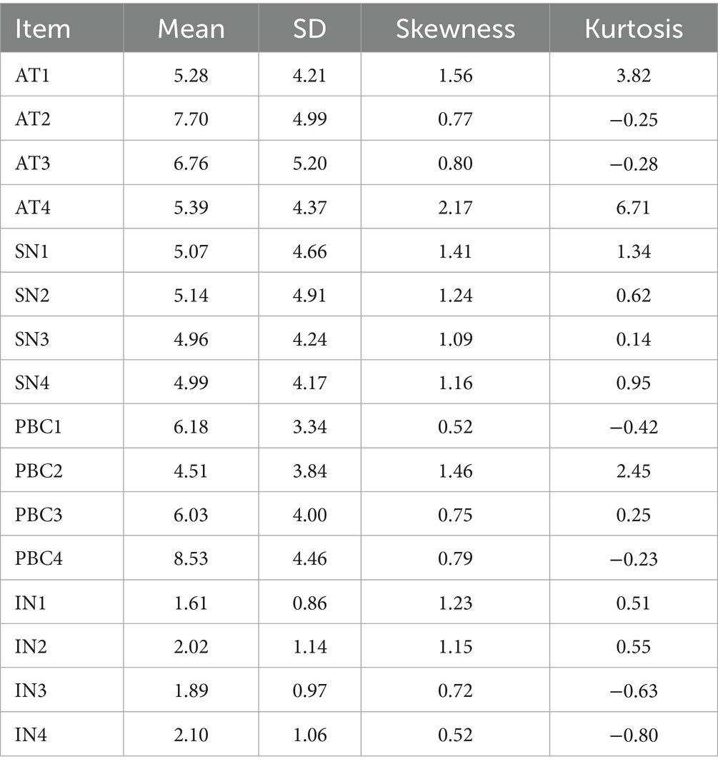 Structural equation modeling (SEM) was applied to evaluate the interrelationships among the TPB constructs. Item-level descriptive statistics were computed to assess normality, including skewness and kurtosis. Although Shapiro–Wilk tests indicated significant deviations from normality for the majority of items, the robust maximum likelihood estimator (MLR) was applied in subsequent SEM analyses to account for non-normality (Mishra, 2020; Bean and Bowen, 2021).