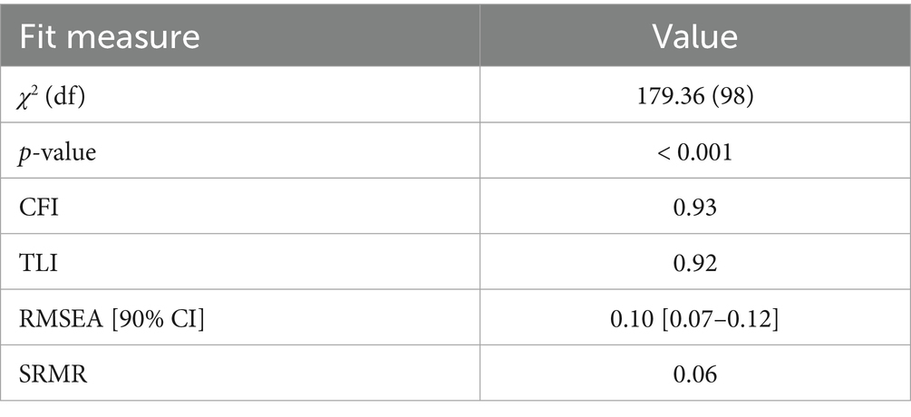 Model adequacy was evaluated using several standard fit indices. Comparative fit index (CFI) and Tucker–Lewis index (TLI) values ≥ 0.95 indicated good fit, and their values ≥ 0.90 indicated acceptable fit. Root mean square error of approximation (RMSEA), with 90% confidence intervals and p-close, indicated close fit at ≤ 0.06 and acceptable fit at 0.06–0.08. Standardized root mean square residual (SRMR) was considered acceptable at ≤ 0.08 (Kline, 2023a; West et al., 2023; Maydeu-Olivares et al., 2024).