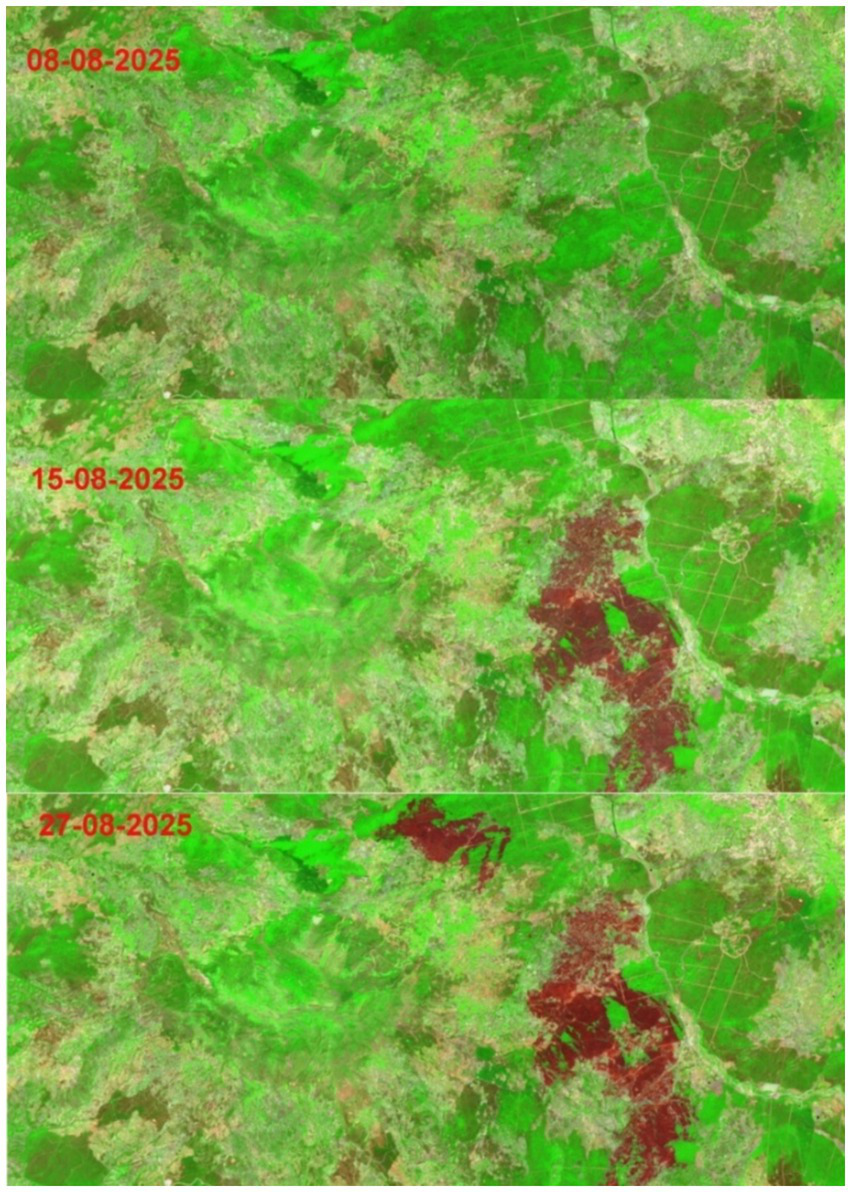 August 2025 Sentinel-2 Short-Wave Infrared (SWIR) Time-Series of Wildfires in Chefchaouen Province, Morocco. This figure shows false-color satellite imagery capturing two different wildfire events in August 2025. On 08 August 2025, the scene appears unaffected, with healthy vegetation highlighted in green. By 15 August 2025, the first fire is clearly visible as a large, burned scar in red tones on the eastern side of the image. A second fire event is detected by 27 August 2025, with new burned areas appearing in the northern part of the scene, while the earlier scar in the east remains evident. Together, these images illustrate the occurrence of two distinct wildfires within the same region over a short time span, emphasizing both the intensity and recurrence of fire activity.