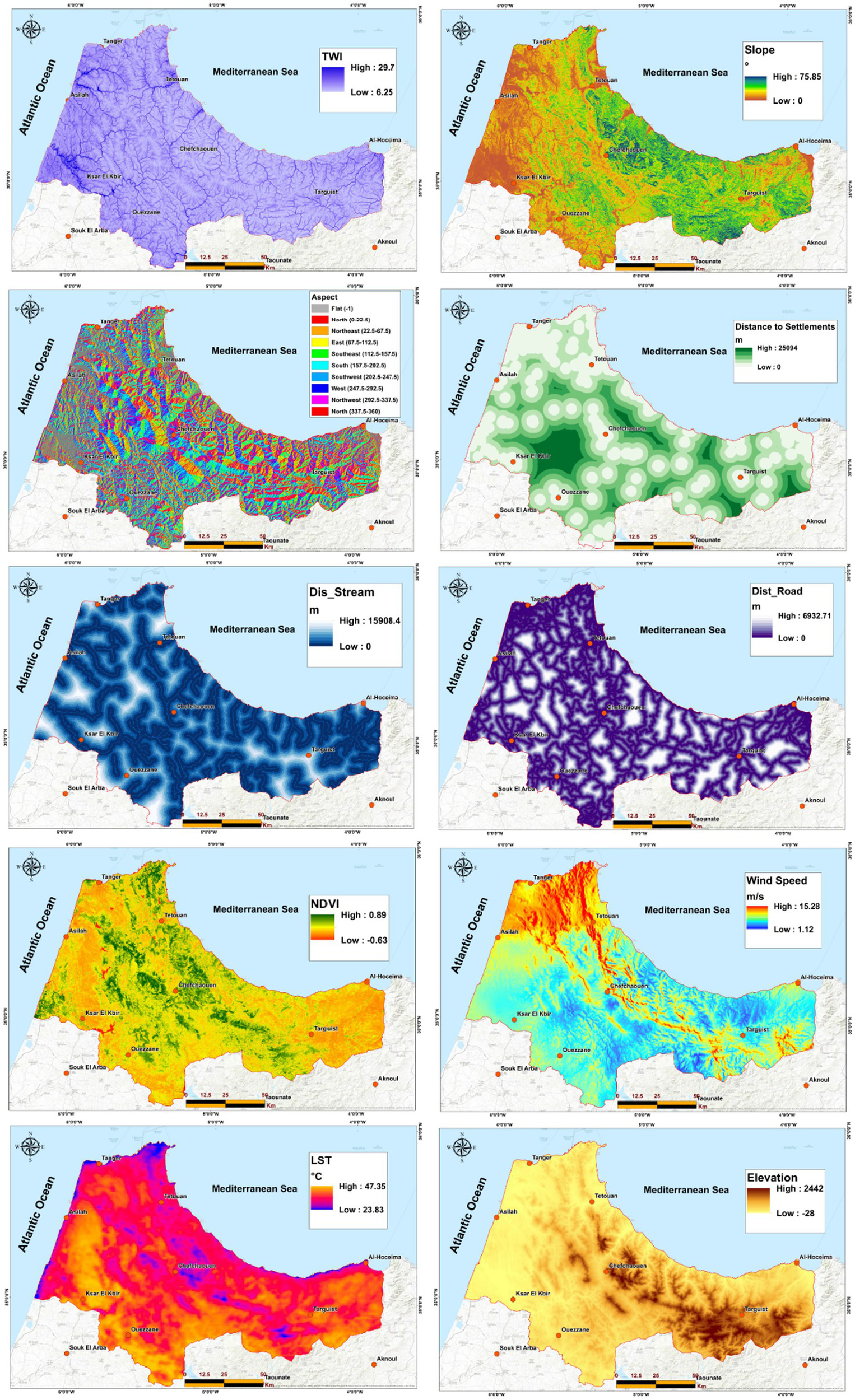 In this study, a combination of environmental, topographic, climatic, and anthropogenic conditioning factors was integrated (Tables 1; Figure 3), as illustrated in the methodological framework (Figure 4). These factors, including aspect, elevation, slope, topographic wetness index (TWI), land surface temperature (LST), wind speed, vegetation indices (NDVI), and proximity indicators (roads, settlements, and water bodies), were selected due to their established influence on fire ignition, spread, and severity (Michael et al., 2021; Singha et al., 2024; Ahmad et al., 2025). Table 2 summarizes the conditioning factors, their effects on wildfire behavior, and the supporting literature.