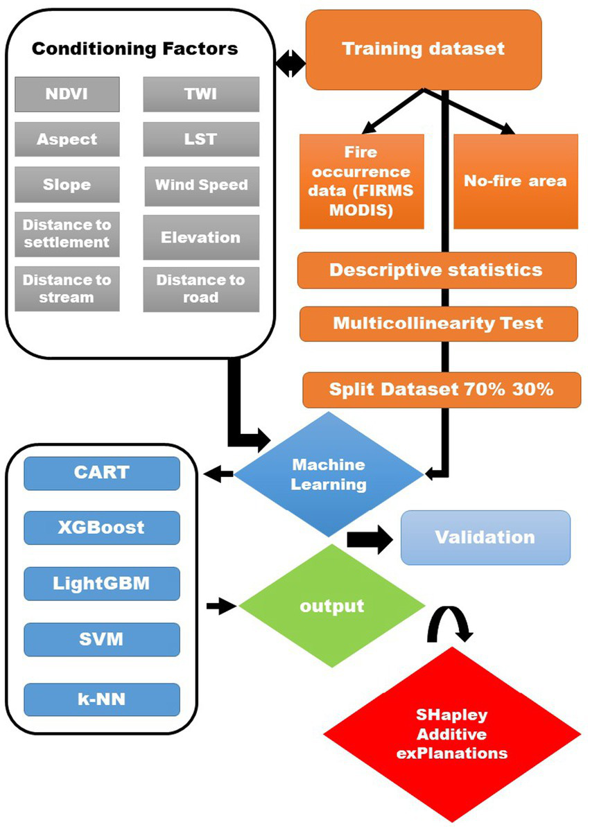 Workflow of wildfire susceptibility modeling using machine learning and SHAP analysis.