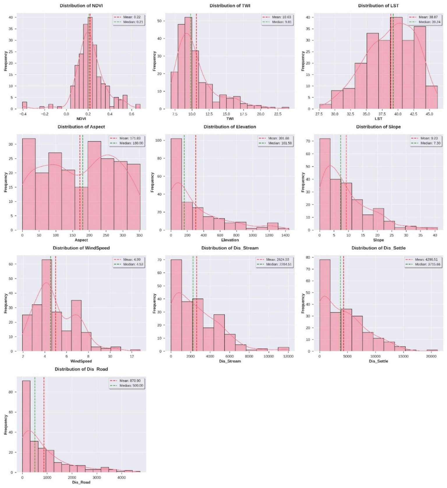 Dynamic variables such as NDVI, LST, and wind speed were derived from remote sensing products corresponding specifically to the summer of 2022, ensuring that all input layers reflect the same environmental and climatic conditions prevailing during that fire season. This temporal alignment between conditioning factors and fire occurrences was essential to preserve internal consistency. Using datasets from multiple years could introduce temporal mismatches, as post-fire vegetation loss or regeneration significantly alters NDVI and surface temperature values in subsequent years. Thus, using static 2022 layers allowed the model to capture realistic pre-fire conditions rather than post-disturbance states.