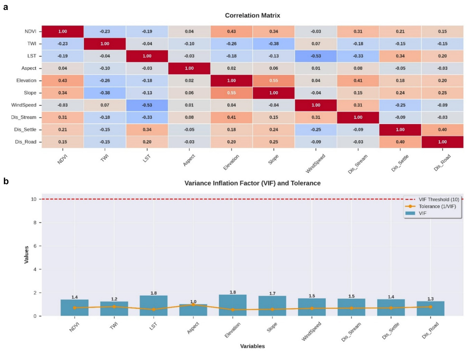 To guarantee the robustness of the analysis, it was necessary to examine the potential presence of multicollinearity among the explanatory variables. Multicollinearity arises when predictors are strongly interrelated, which can lead to redundancy and distort model outputs. A widely recognized approach for diagnosing this issue is the Variance Inflation Factor (VIF) (Moumane et al., 2025).