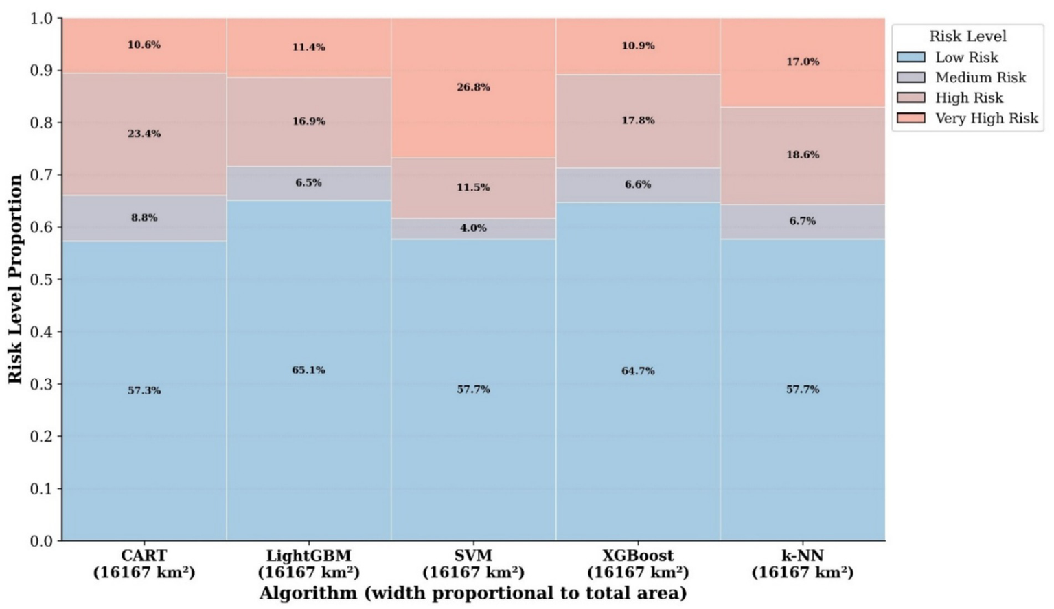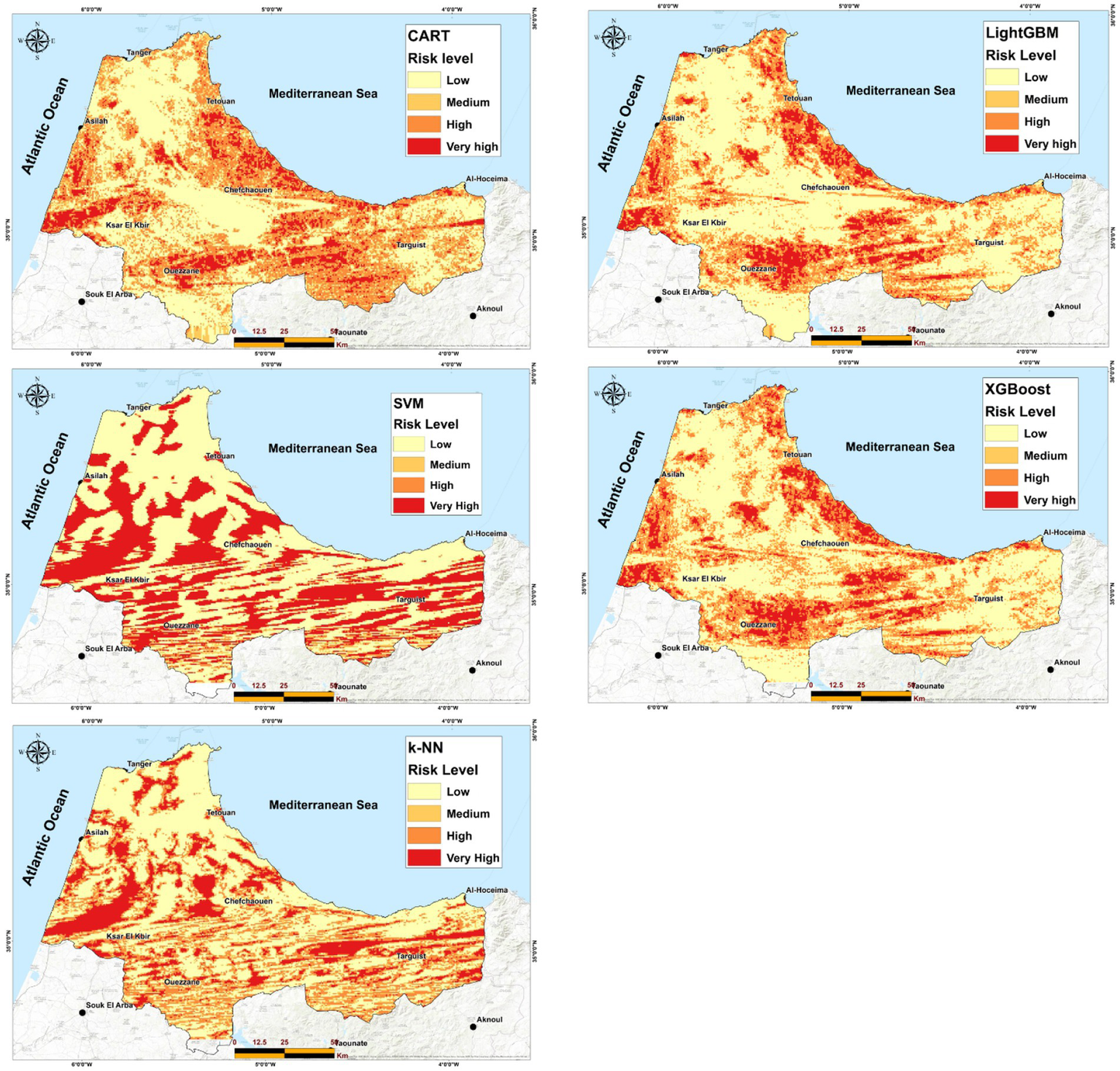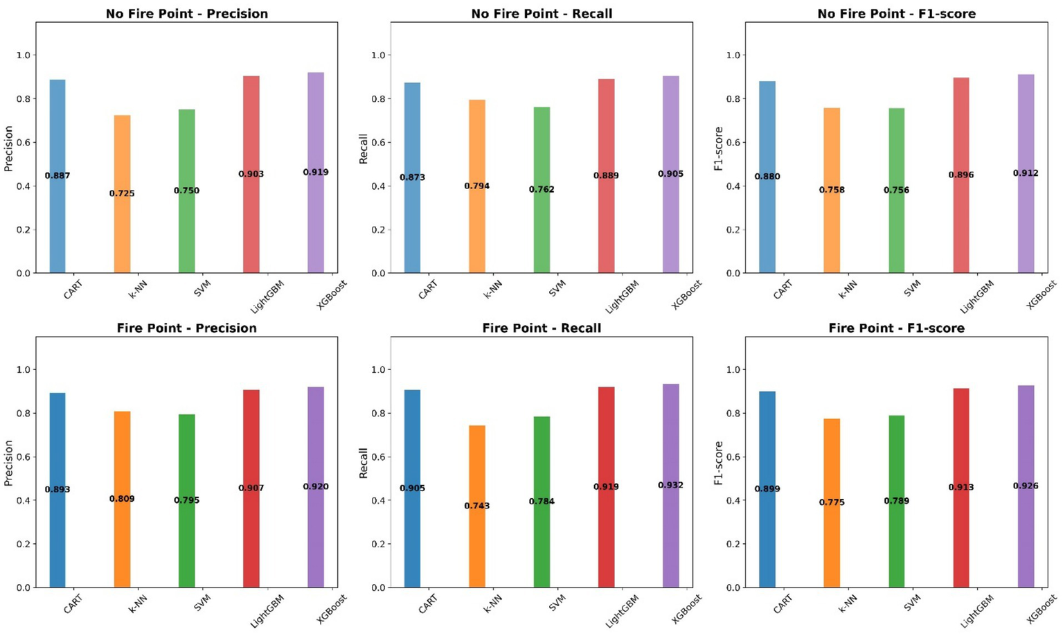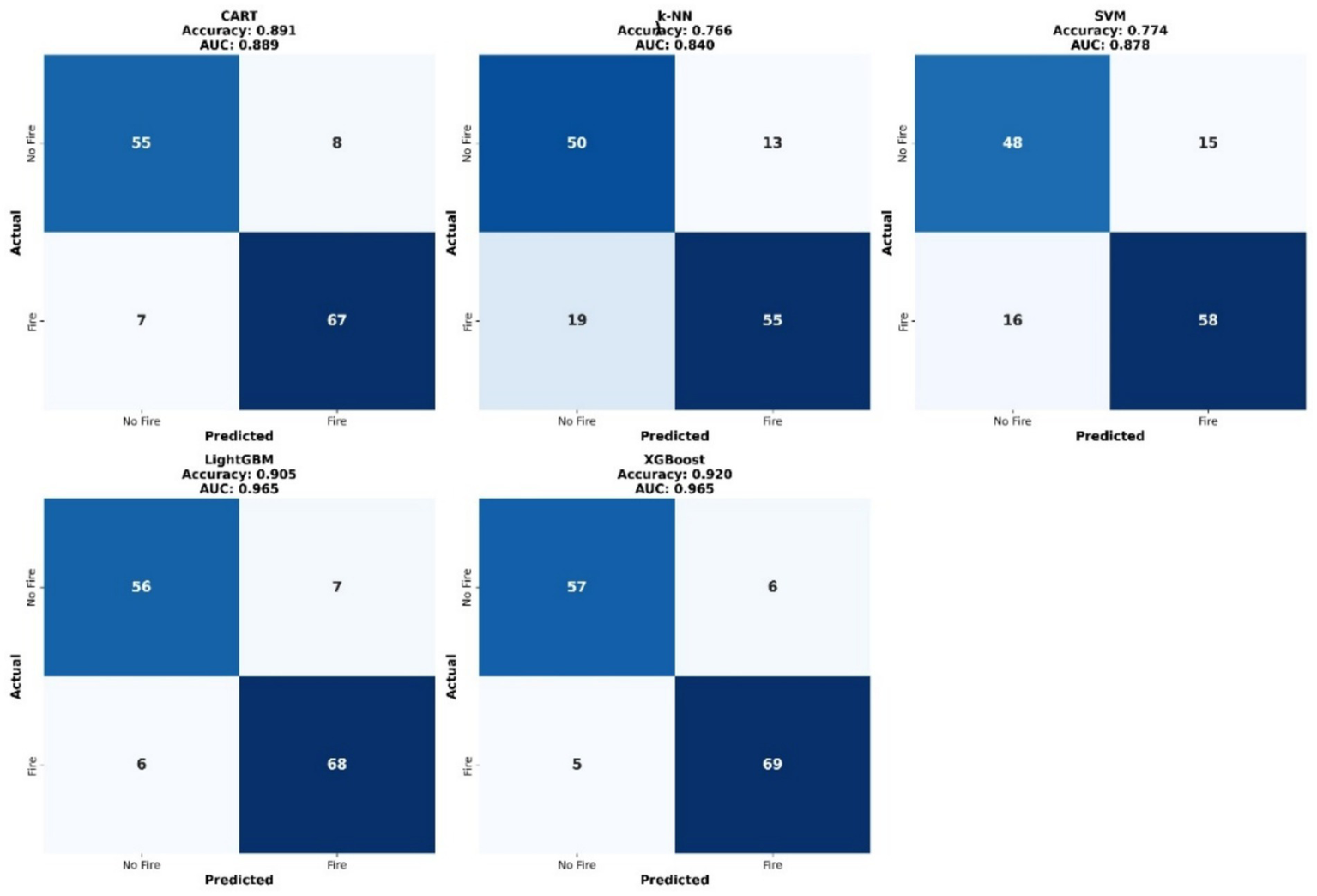 Machine learning has become a cornerstone in wildfire risk assessment, offering robust frameworks to model complex, nonlinear relationships between environmental factors and fire occurrence. Among the spectrum of ML approaches, methods such as Classification and Regression Trees (CART), Random Forest (RF), Support Vector Machine (SVM), k-Nearest Neighbors (k-NN), XGBoost, and LightGBM stand out for their proven effectiveness (Table 4).