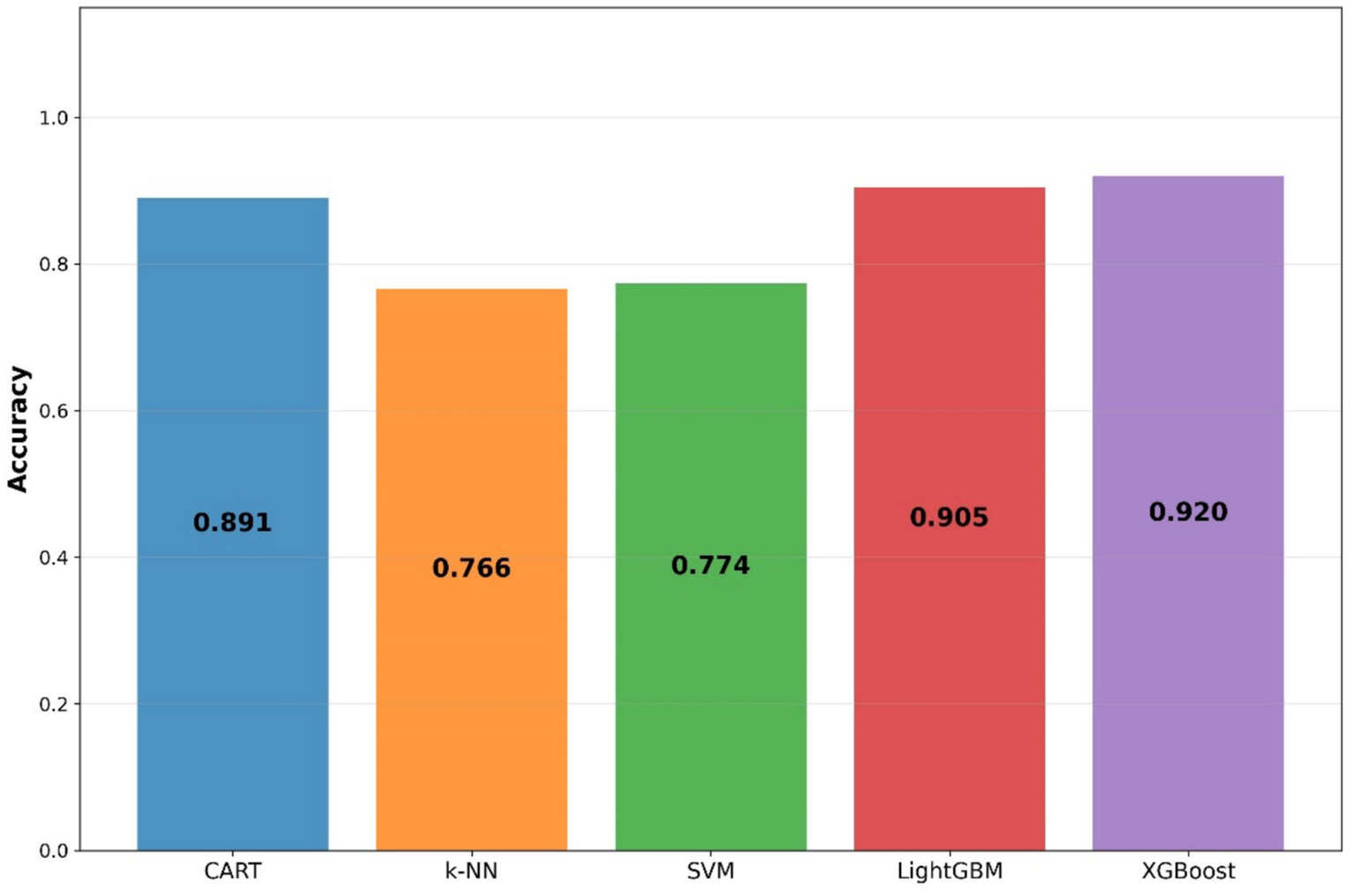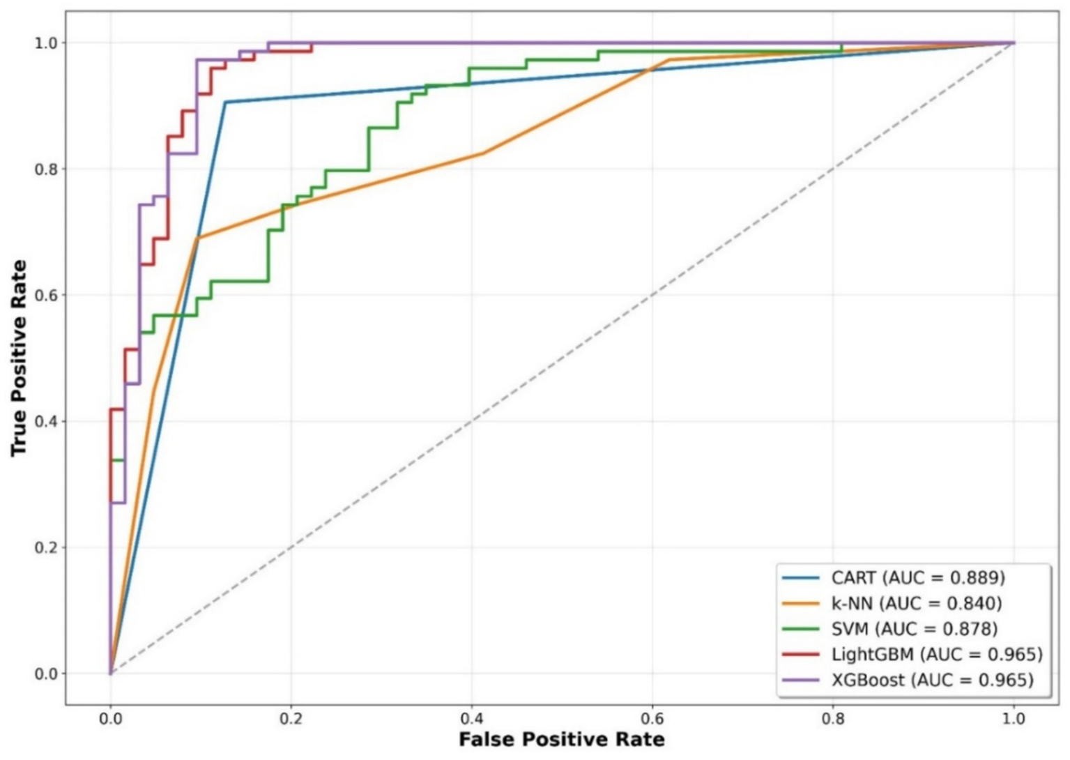 All machine learning modeling and computational experiments were conducted within the Google Colaboratory cloud-based environment. The analyses were performed using Python 3.10.12, leveraging a suite of standard data science and machine learning libraries, including `scikit-learn` for CART, SVM, and k-NN implementations, `XGBoost`, and `LightGBM`. To ensure the complete reproducibility of all results, a fixed random seed of `42` was implemented globally. This seed was consistently applied to the train-test data split and to the initialization of all stochastic algorithms.