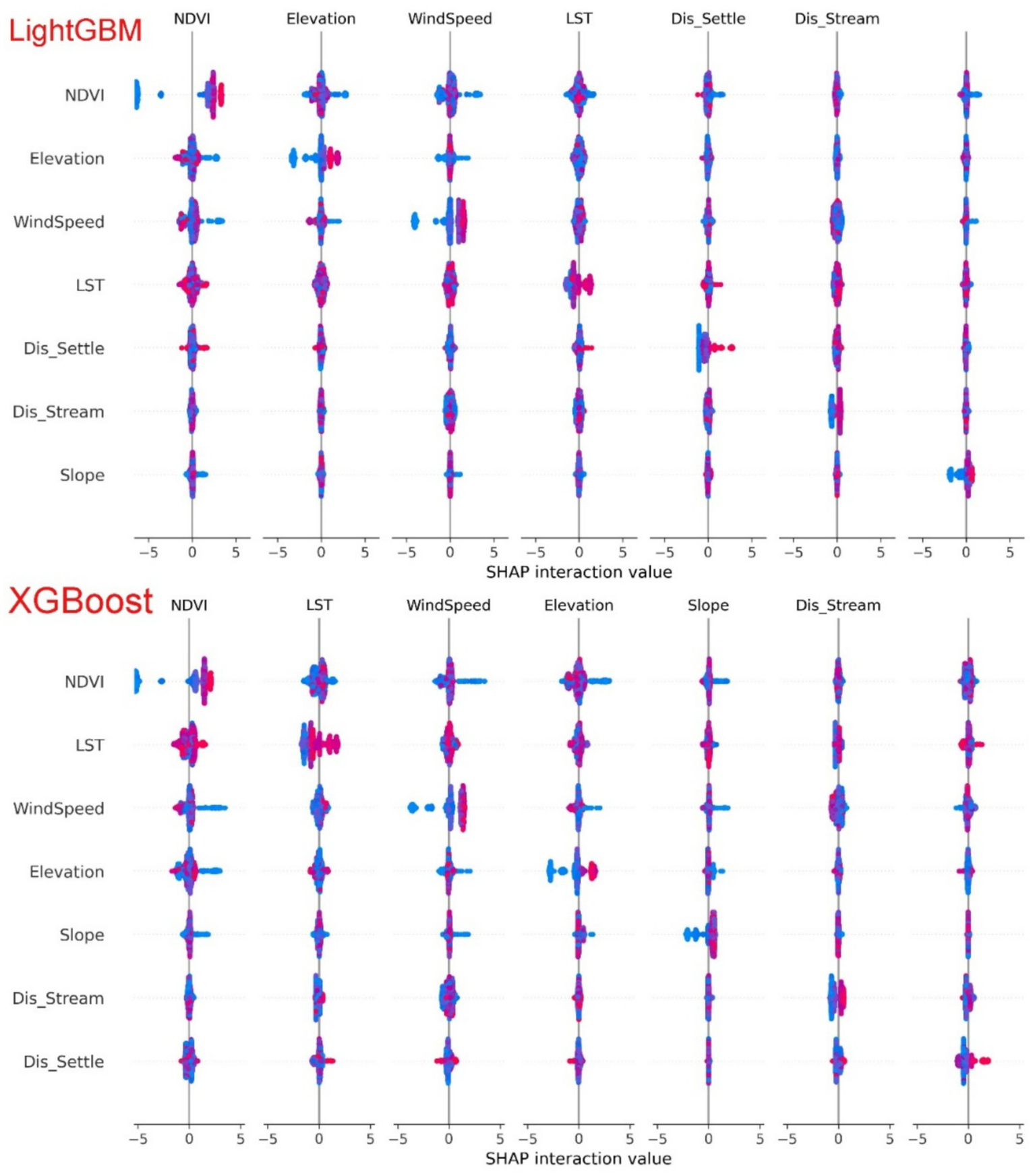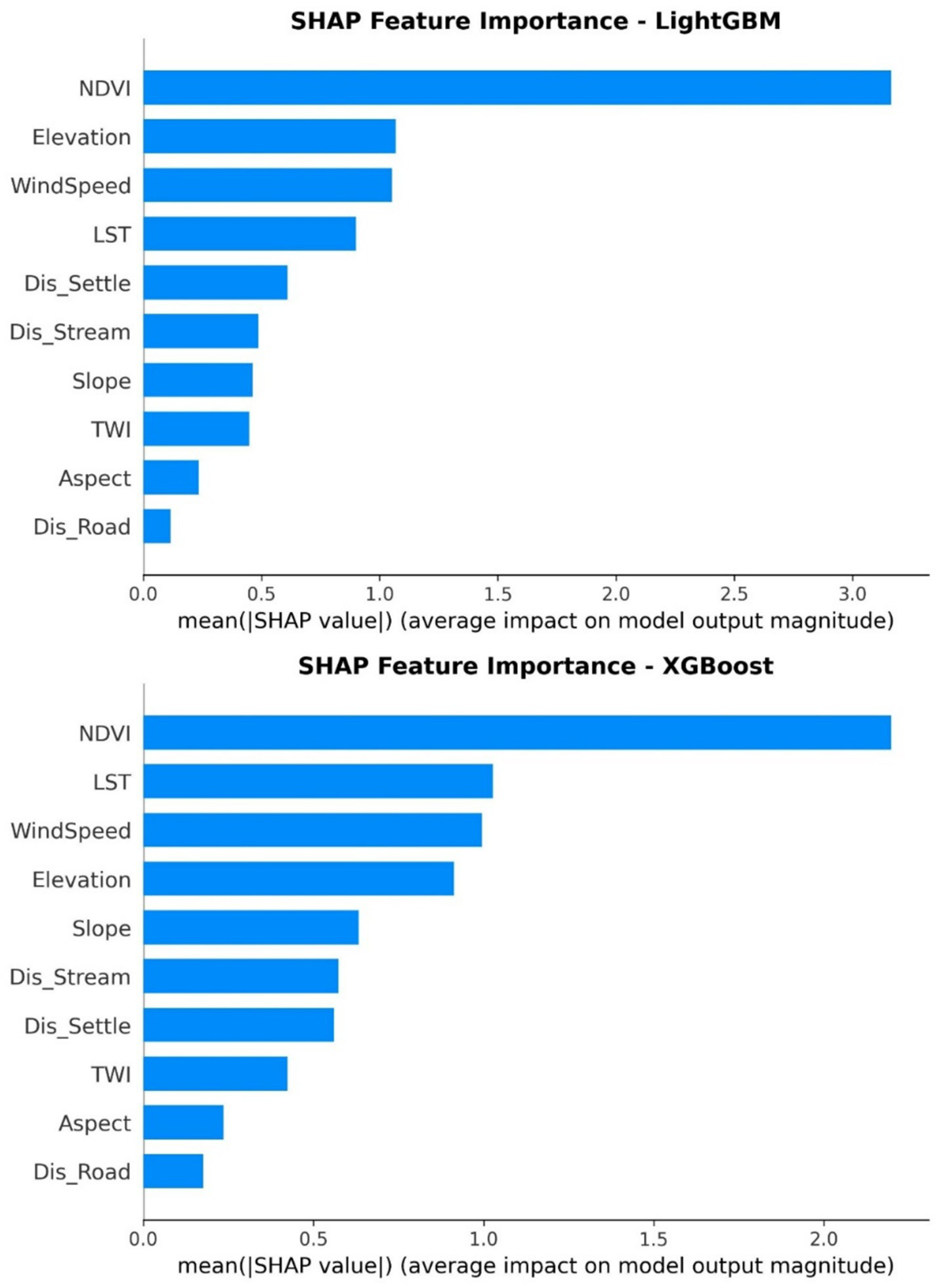 To complement the machine learning models, we employed the SHAP framework to interpret the contribution of conditioning factors to wildfire susceptibility. SHAP is grounded in cooperative game theory and provides a unified measure of feature importance by assigning each predictor a marginal contribution to the model’s output. Unlike traditional importance metrics that only capture global relevance, SHAP values enable both global interpretation (ranking variables by their average influence across the study area) and local interpretation (examining how each factor drives individual predictions).