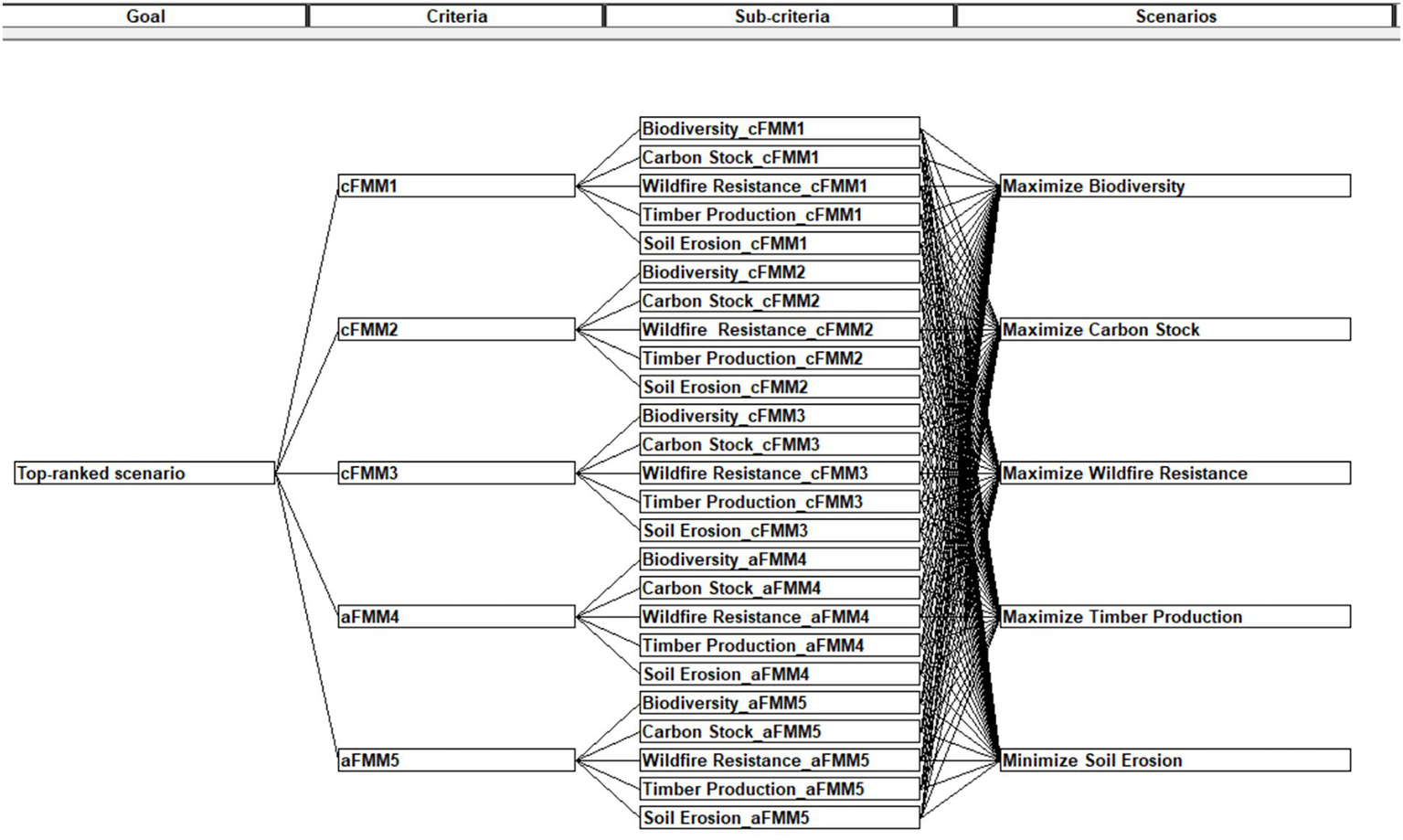 Figure 3. Decision hierarchy built using CDP. cFMMl, cFMM2, cFMM3, aFMM4, and aFMM5 account for stand-level management models for Eucalyptus, Maritime pine, Chestnut, Cork oak, and Pedunculate oak, respectively.