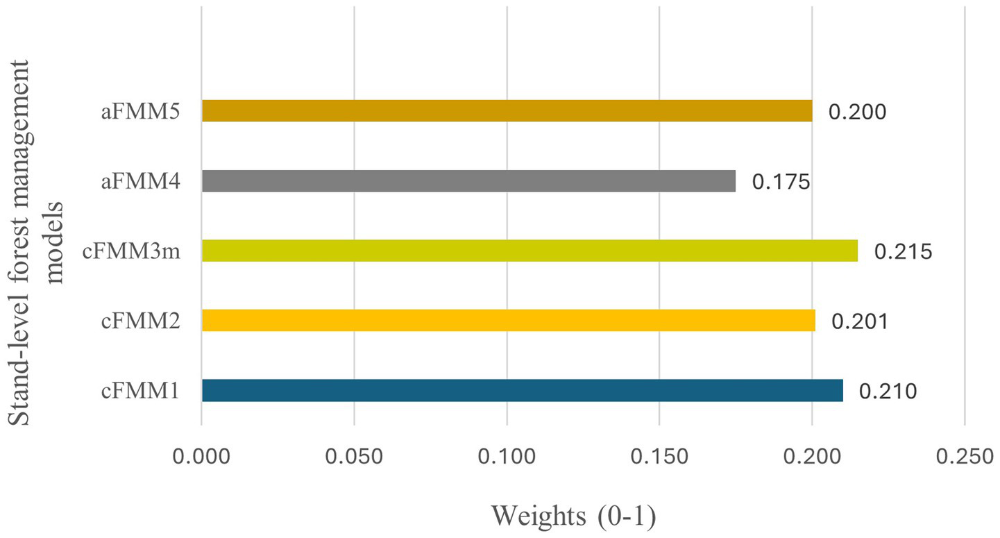 In the case of criteria (Figure 5), cFMM3 received the highest weight (0.215), followed closely by cFMM1 (0.210), while aFMM5 was assigned the lowest weight (0.175). However, the difference in weights between the top two stand-level management models was relatively small.
