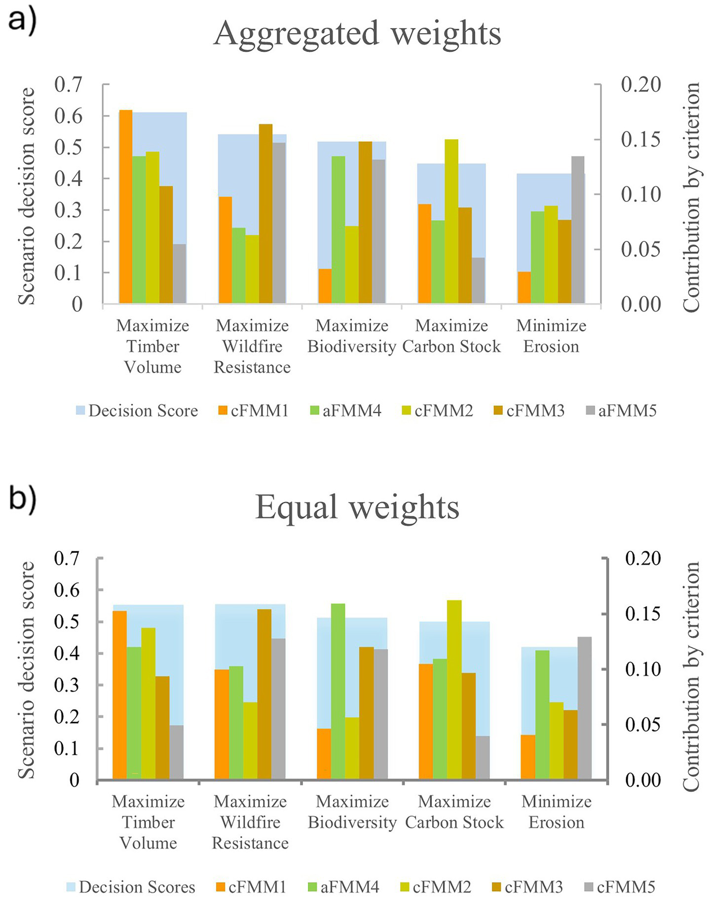 Figure 8. Contribution of criteria to the decision scores: (a) when stakeholder-assigned weights were considered, and (b) when equal weights were considered. The contribution of each management model to the final scenario score reflects its aggregated performance across all ecosystem service indicators, not only the service being maximized in the LP formulation.