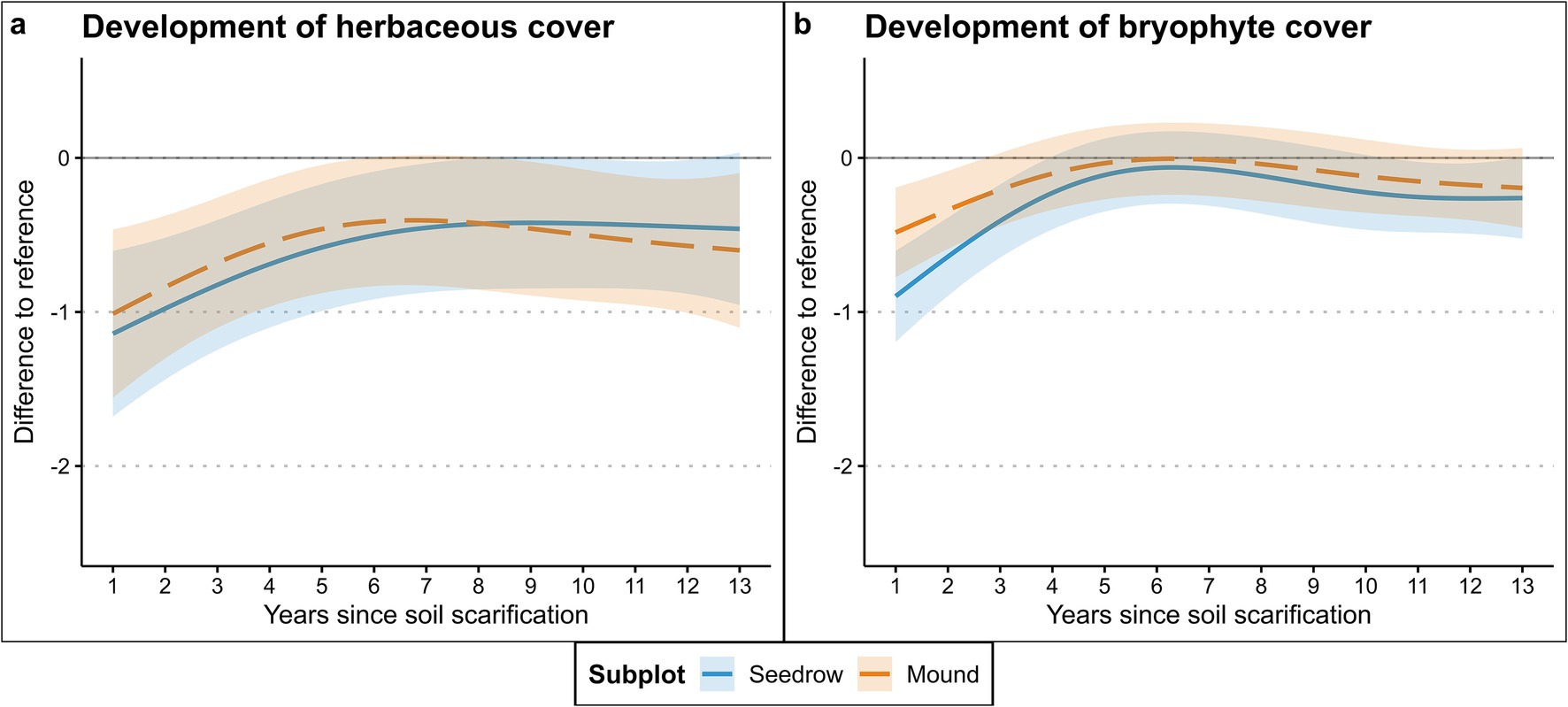 Figure 2. Cover development of the (a) herbaceous vegetation and (b) terricolous bryophytes after soil scarification modeled via GAMs (Table 2). Shaded areas represent 95% confidence interval.