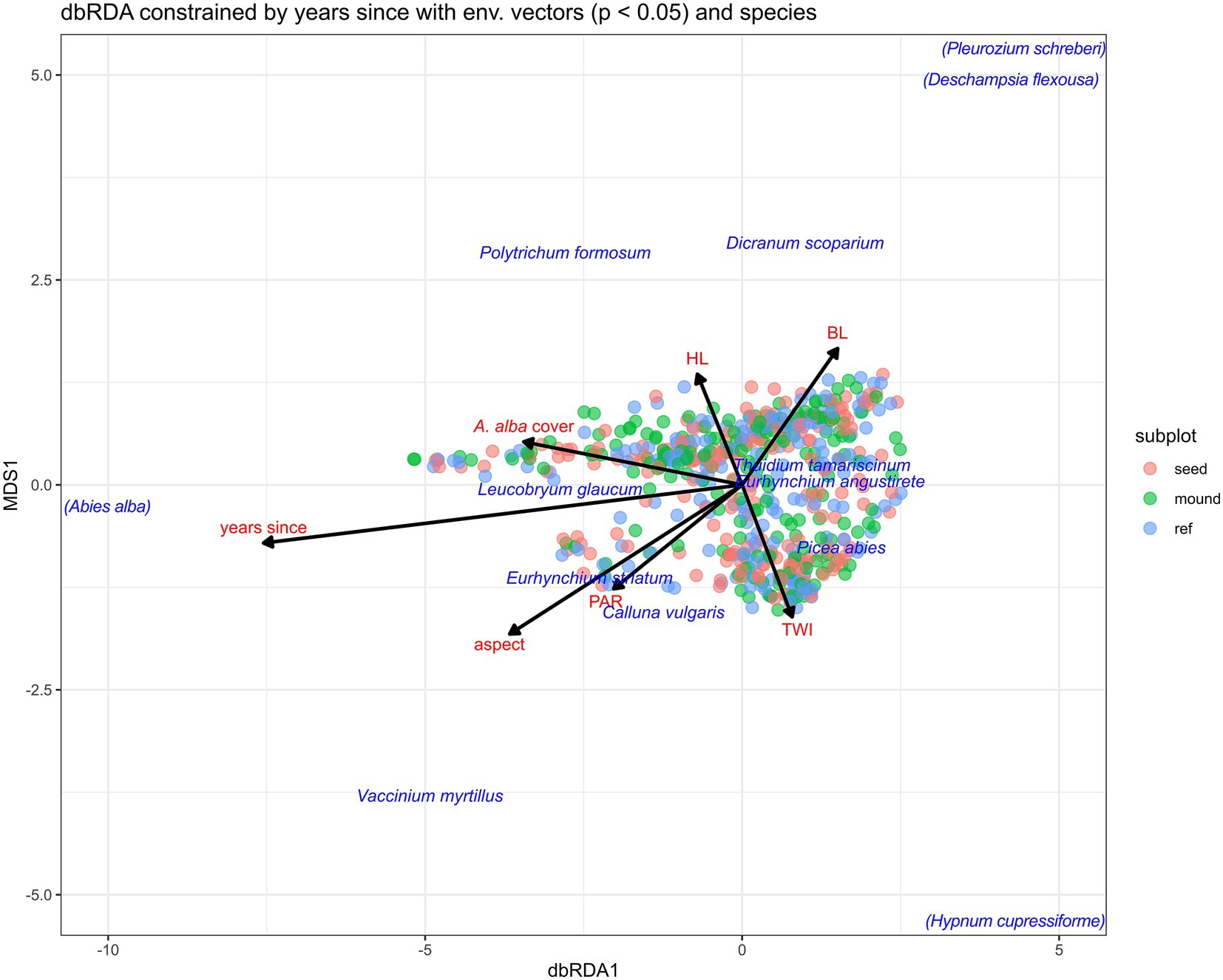 Scatter plot of dbRDA analysis constrained by years since environmental vectors and species. Data points in red, green, and blue represent seed, mound, and reference subplots, respectively. Vectors indicate environmental factors and species correlations. Species names are shown in blue, with arrows representing vectors such as “years since,” “aspect,” “PAR,” “HL,” “BL,” and “TWI shown in red.”