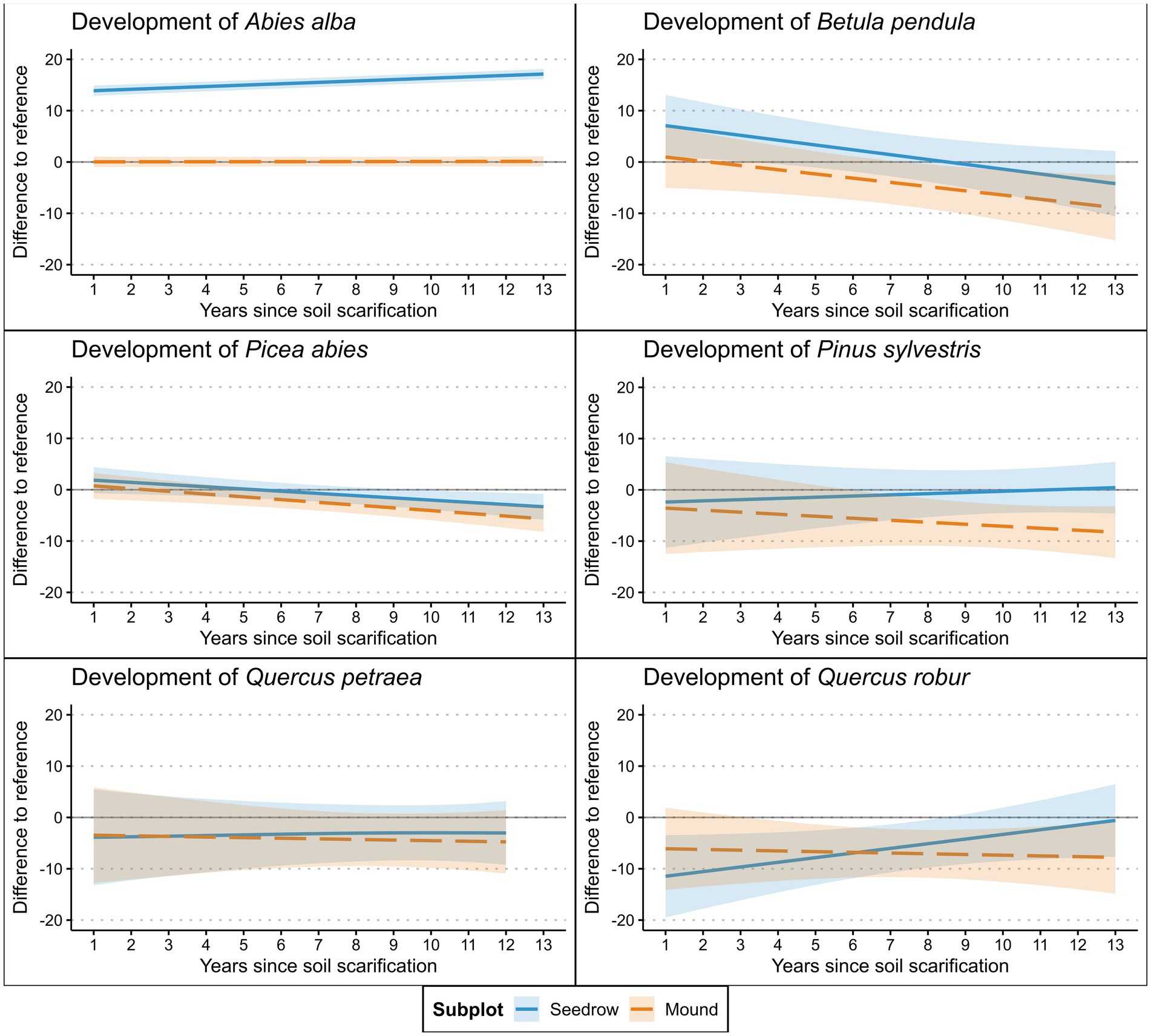 Graphs show the development of six tree species over 13 years since soil scarification, comparing differences to a reference. Each graph includes lines for seedrow and mound subplots, with shaded areas representing confidence intervals. Graphs A-F represent Abies alba, Betula pendula, Picea abies, Pinus sylvestris, Quercus petraea, and Quercus robur, respectively. Seedrow trends (blue lines) vary: some increase slightly, while others show slight declines or stability. Mound trends (orange lines) generally indicate stability or slight decline. Each graph is labeled with species names.