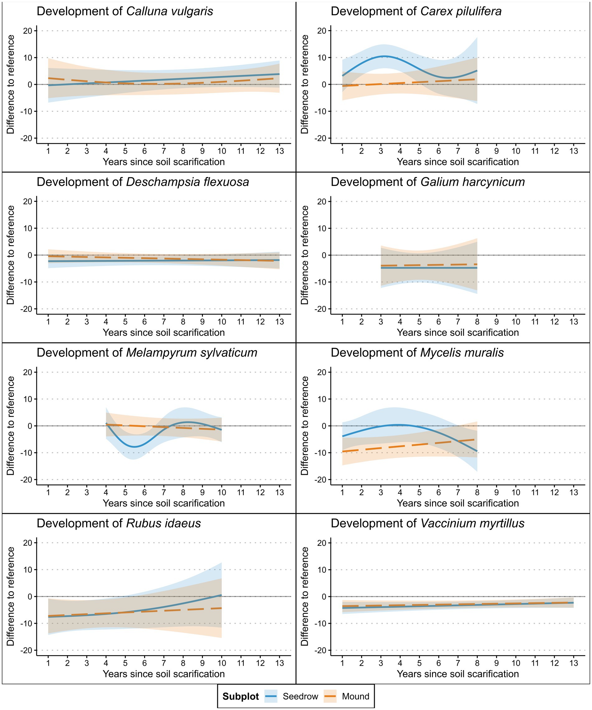 Eight line graphs showing the development of plant species over 13 years since soil scarification. Each subplot represents one species: A) Calluna vulgaris, B) Carex pilulifera, C) Deschampsia flexuosa, D) Galium harcynicum, E) Melampyrum sylvaticum, F) Mycelis muralis, G) Rubus idaeus, H) Vaccinium myrtillus. The y-axis represents the difference to reference, and the x-axis represents years. Two plot types are indicated: seedrow (blue) and mound (orange). Shaded areas show variability. Graphs highlight trends and differences in plant development over time.