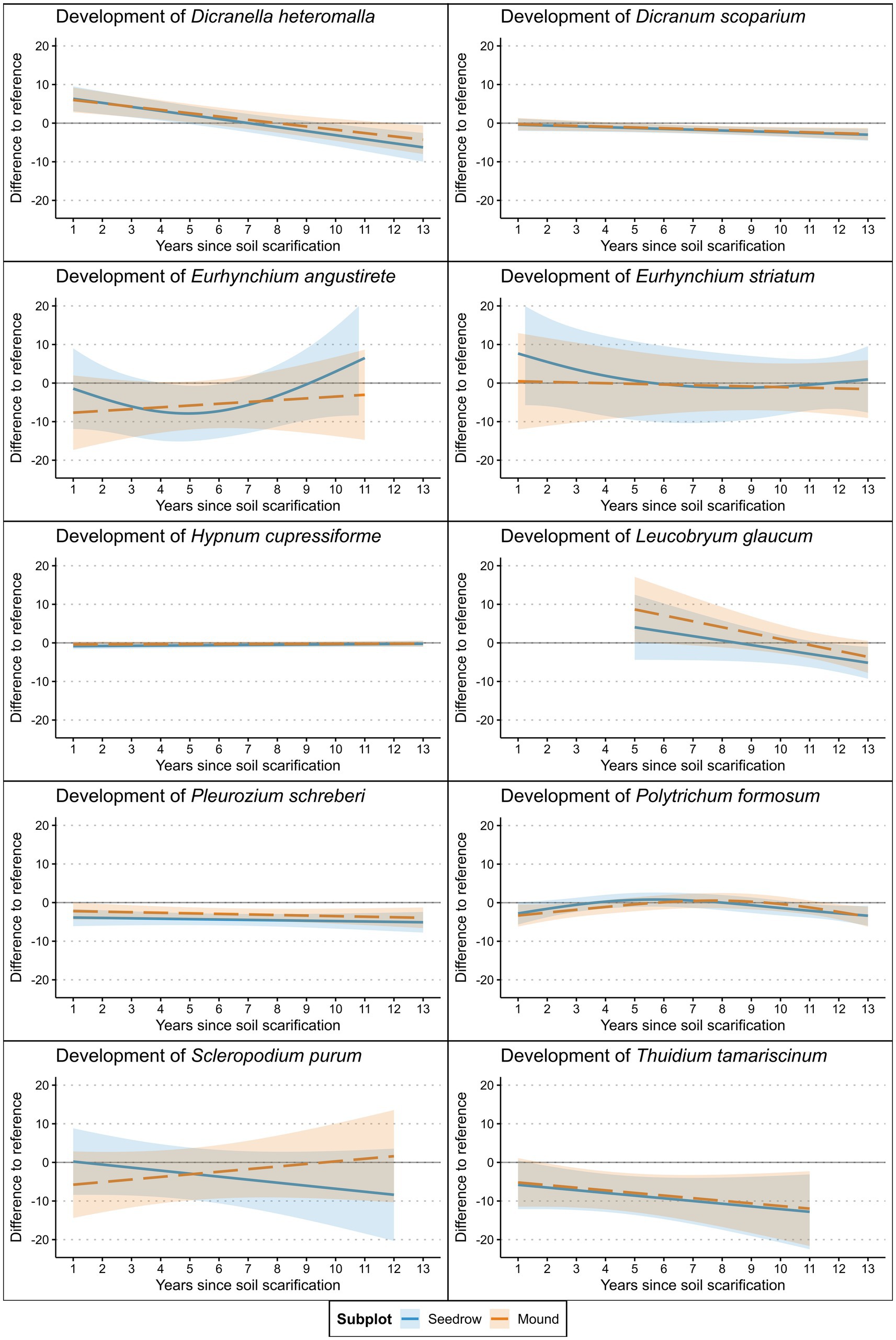 Graphs depicting the development over time of various moss species after soil scarification. Each subplot shows the difference to a reference over 13 years for species: Dicranella heteromalla, Dicranum scoparium, Eurhynchium angustirete, Eurhynchium striatum, Hypnum cupressiforme, Leucobryum glaucum, Pleurozium schreberi, Polytrichum formosum, Scleropodium purum, and Thuidium tamariscinum. The data is represented with solid lines for mounds and dashed lines for seedrows, including confidence intervals. Each subplot varies in trends, illustrating species’ response over time.