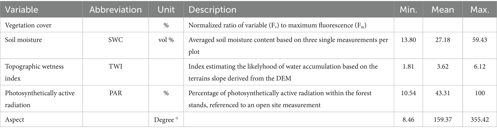 Table 1. The surveyed environmental variables with abbreviations, units, and a brief description.