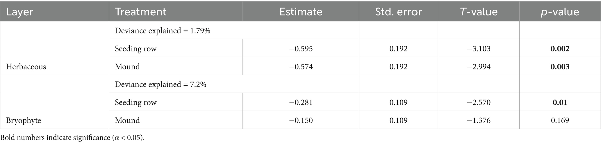 In the GAM analysis of total cover exclusively, the cover of A. alba, as the target species of the direct seeding operations, was excluded from the seeding rows and mounds, as the focus of the study was on the naturally occurring species. However, A. alba was sporadically present within the canopy of forest sites adjacent to the survey sites and naturally regenerating, leading to the assumption that all individuals on the forest floor originated from natural regeneration. Consequently, the presence of A. alba cover within the forest floor was documented (in total, 10 out of 200 plots exhibited A. alba presence on the forest floor). While it’s possible that seeds were transported by animals from the seeding rows onto the forest floor, the presence of fruiting A. alba stands near the excluded plots suggests that the seeds are falling directly to the forest floor. This is supported by observing the age differences between the seedlings in the seeding rows and those on the forest floor. While this also poses the potential of individuals in the seeding row originating from this seed rain, the age difference between individuals in the seeding row and those on the forest floor, combined with the very low number of individuals observed outside the row, makes this highly unlikely. In subsequent species-specific modeling, A. alba was included, serving as a reference for the development as the direct seeding target species.
