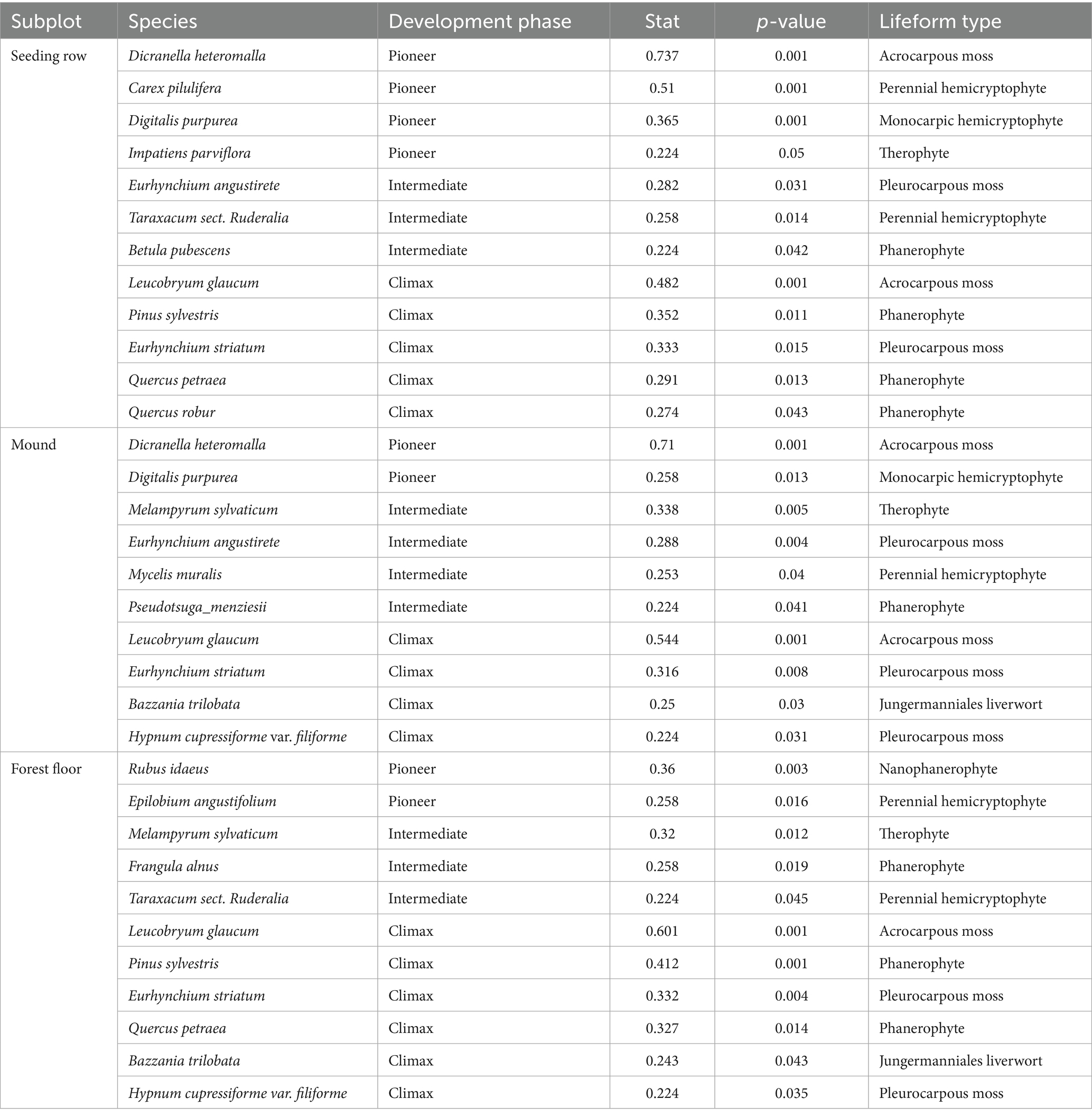 Of the 84 species, in total, twenty species were identified as indicators across all subplots and developmental phases (Table 3). In the pioneer phase (1–4 years following scarification), Dicranella heteromalla and Digitalis purpurea were both identified as indicator species within the seeding rows and mounds, while Carex pilulifera and Impatiens parviflora were identified as additional indicator species of the seeding rows. Thus, acrocarpous mosses and hemicryptophytes were the predominant life forms in these subplot types regarding indicator species. On the forest floor, Rubus idaeus and Epilobium angustifolium were identified as indicators. In the intermediate phase (5–8 years since scarification), the identified indicator species overlapped among all subplot types, including Taraxacum sect. Ruderalia as a shared indicator between the seeding row and forest floor (Table 3). Eurhynchium angustirete was a shared indicator species between the seeding rows and the mounds, while Melampyrum sylvaticum was a prevalent indicator species between the mounds and the forest floor. During the climax phase (10–13 years following scarification), the indicator species exhibited a persistent increase in similarity between subplots (Table 3). Leucobryum glaucum and Eurhynchium striatum were identified in all three subplot types. A greater number of tree species were identified as indicators here, including Quercus petraea and Pinus sylvestris, which served as indicators for the seeding rows and the forest floor. Bazzania trilobata was the sole liverwort species identified as an indicator in both mounds and the forest floor. In this development phase, pleurocarpous mosses and phanerophytes were the most dominant life form types. In addition to the identified indicator species, an average of six species unique to the scarification subplots were found within the first 10 years after the scarification; however, the number of individuals was low. During this timeframe, 12 herbaceous species were identified as being unique to the disturbance, however, no terricolous bryophytes were observed (Supplementary Materials).