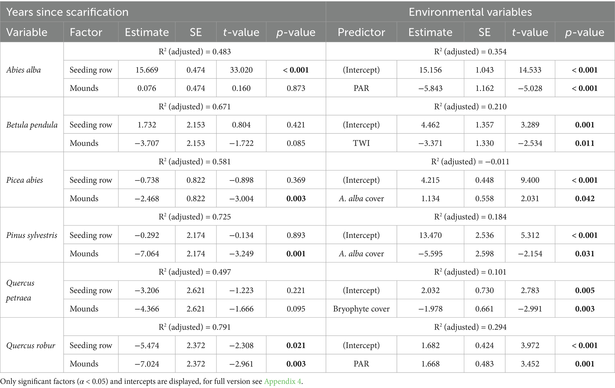 Of the five naturally occurring tree species in the regeneration, B. pendula exhibited higher cover in the seeding row, though only within the first two years after scarification, while Quercus robur demonstrated significantly lower cover (Table 4). P. abies, P. sylvestris, and Q. robur exhibited significantly lower cover on the soil mounds (Figure 4). Photogenically active radiation (PAR) positively impacted the cover of Q. robur but was negatively associated with the cover of A. alba. P. sylvestris exhibited a negative response to higher cover proportions of sown A. alba, whereas P. abies appeared to benefit from it. Additionally, B. pendula cover was negatively influenced by TWI, which indicates higher potential water availability. Q. petraea cover was negatively influenced by bryophyte presence.