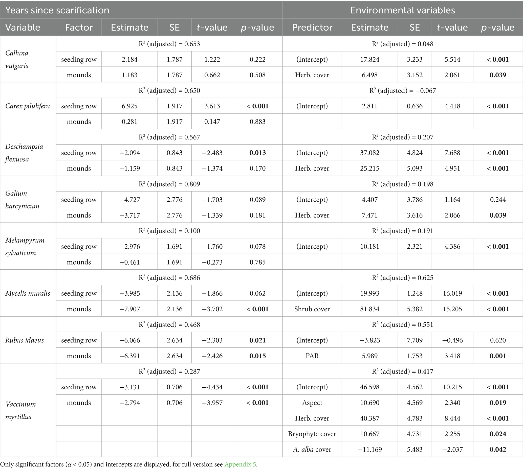 Table 5. Shortened version of summary statistics of the generalized additive models (GAM) of the most common herbaceous species with the cover development after scarification and environmental variables after model simplification.