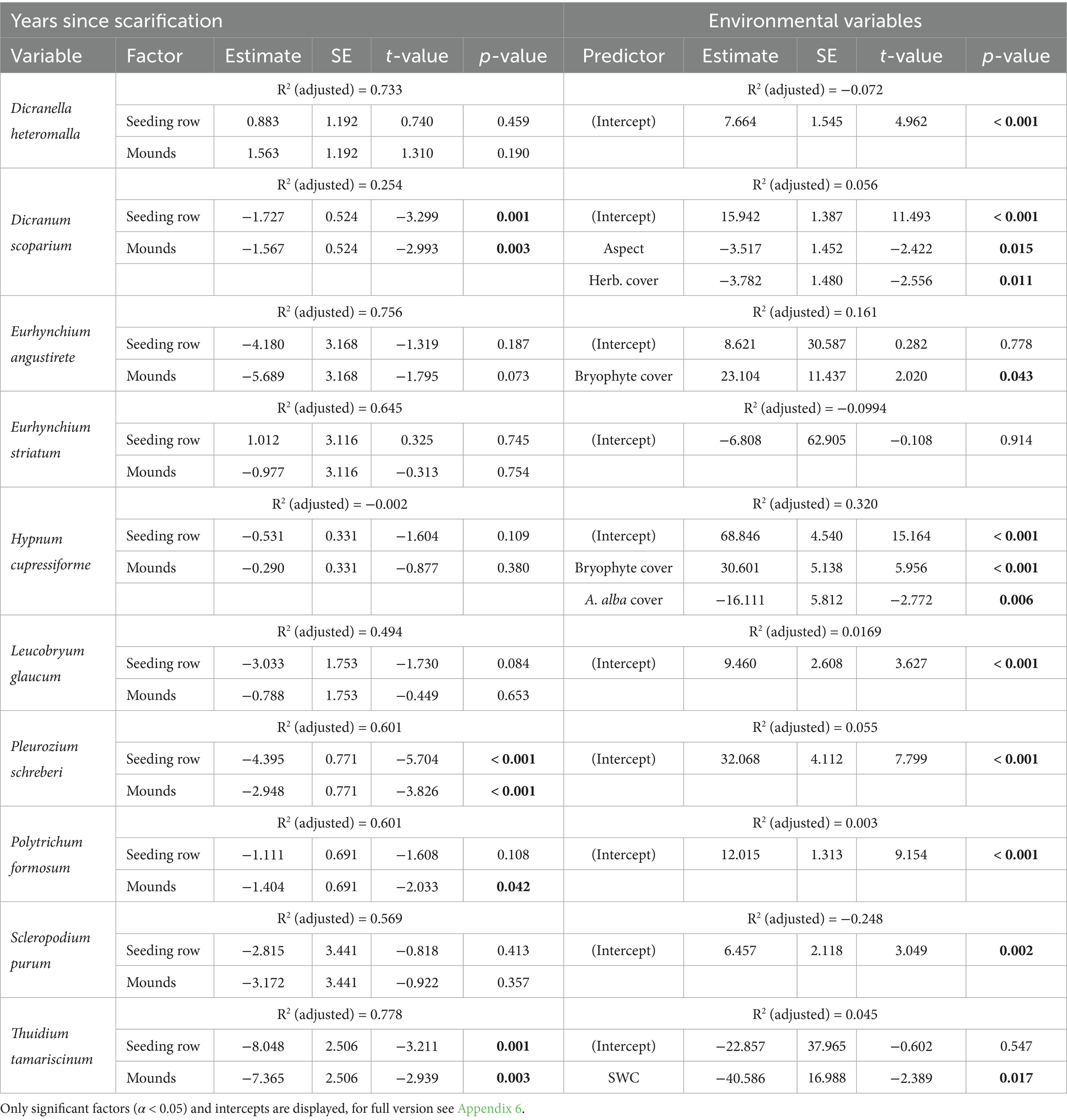 Table 6. Shortened version of summary statistics of the generalized additive models (GAM) of the most common terricolous bryophytes with the cover development after scarification and environmental variables after model simplification.