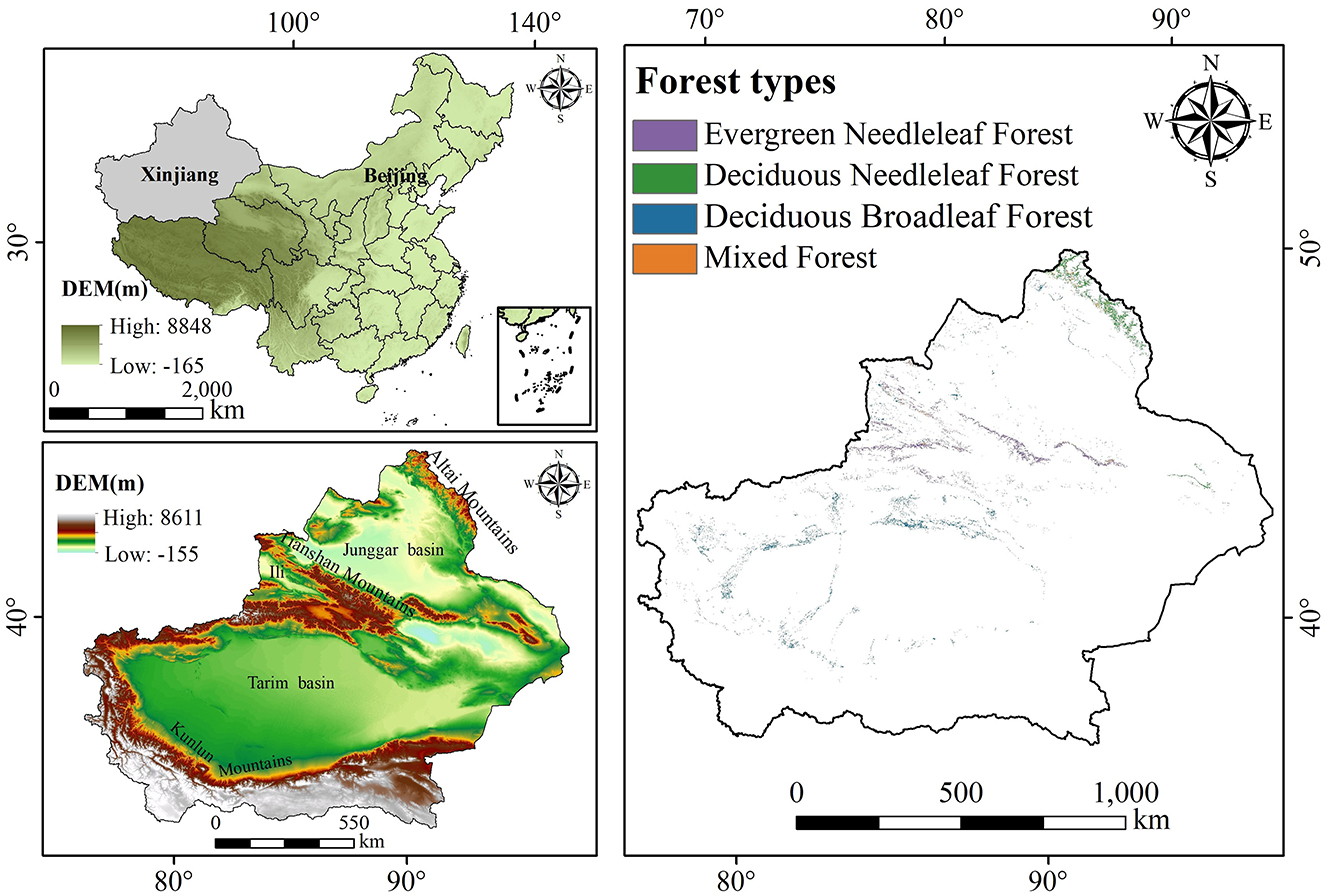 Situated deep within the Eurasian continent, Xinjiang is located in northwestern China and is characterized by a typical temperate continental arid climate. This climate features significant temperature fluctuations, scarce precipitation, and high rates of evaporation. The region's vegetation is primarily composed of grassland, forest, and cropland. Forests cover an area of 8.96 × 104 km2, which corresponds to a forest coverage rate of 5.02% (Shi et al., 2020). The total standing timber volume is 4.65 × 108 m3, with a forest stock volume of 4.27 × 108 m3. These forests serve as an invaluable ecological barrier for northwestern China. Given the region's environmental conditions and developmental needs, its forests are crucial for environmental optimization, the stabilization of ecological balance, and the support of sustainable socioeconomic progress (Zheng et al., 2016). As shown in Figure 1, forest resources in Xinjiang comprise four principal types. Evergreen Needleleaf Forest (ENF), dominated by Picea schrenkiana, is found on the northern and southern slopes of the Tianshan Mountains. Deciduous Needleleaf Forest (DNF) is primarily composed of Larix sibirica. The quintessential species of Deciduous Broadleaf Forest (DBF) is Populus euphratica, which grows rapidly in the Tarim River basin and is widespread despite having a relatively low average biomass. Lastly, Mixed Forest (MF) consists mainly of Picea obovata and Populus tremula, where the stands are typically sparse and composed of short trees (Chen et al., 2023).