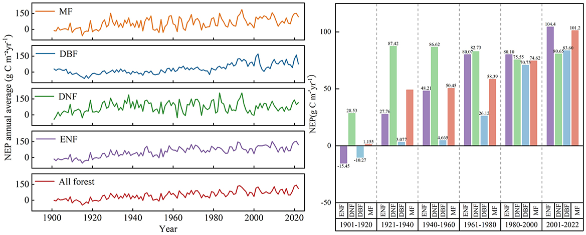 Figure 2. Annual mean NEP of Xinjiang forests from 1901 to 2022 (for all forests combined and for individual forest types), along with the mean values for each forest type over twenty-year intervals (with the 2001-2022 period covering 22 years).