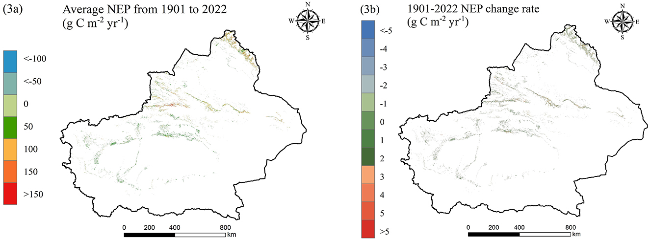 Figure 3. Spatial distribution map of average NEP and change rates of forests in Xinjiang from 1901 to 2022.