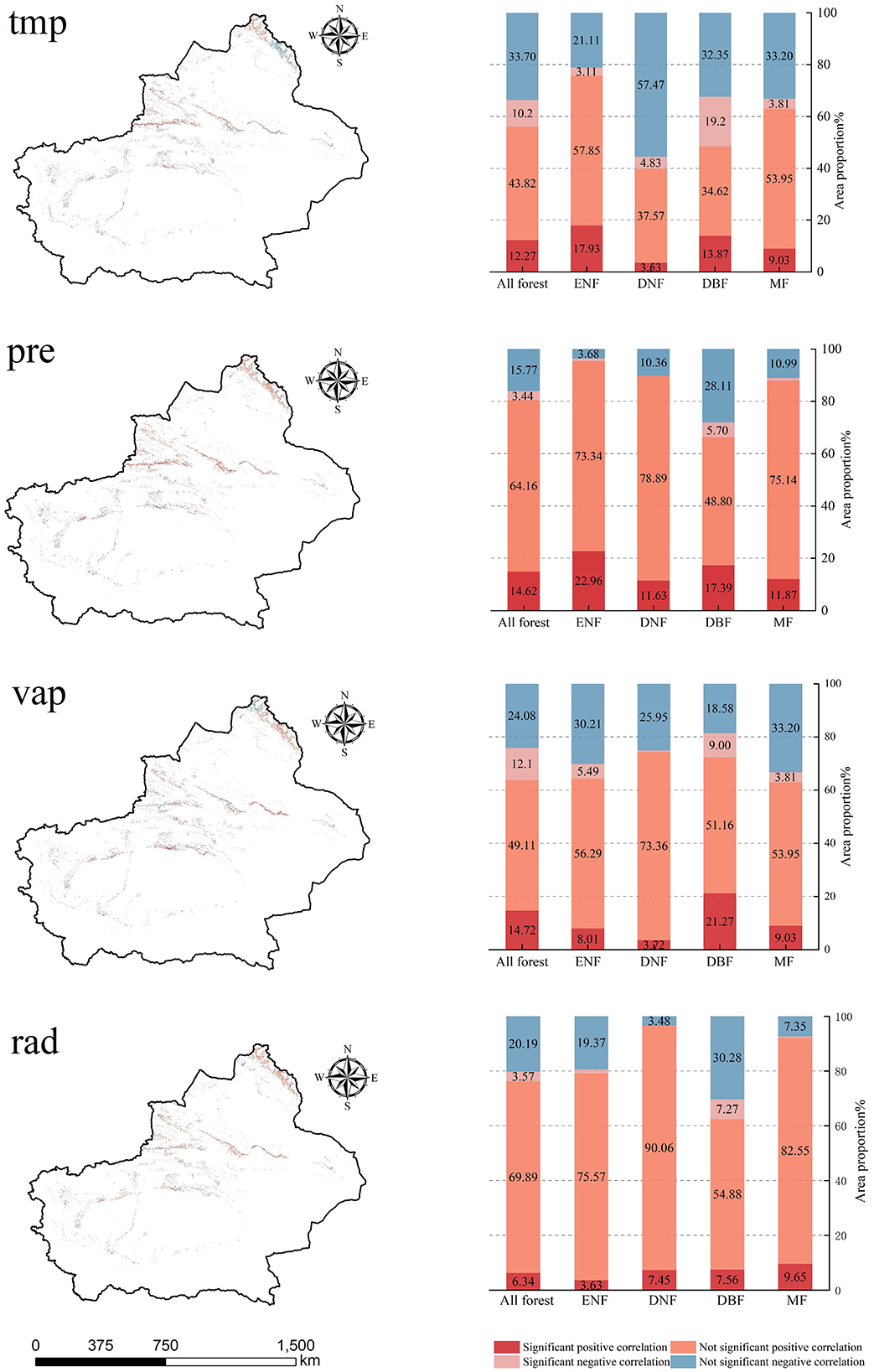 As shown in Figure 5, temperature and NEP were positively correlated across 56.09% of Xinjiang's total forest area, with 12.27% of this area showing a significant positive correlation. Among the forest types, this positive relationship was most dominant in ENF, covering 75.78% of its distribution, particularly in the Tianshan and Altai mountain forest zones. This suggests that for ENF, rising temperatures have a marked promotional effect on NEP. Conversely, negative correlations were concentrated in the primary distribution areas of DNF, such as the coniferous belt surrounding the Junggar Basin, where the negative correlation reached 71.34%. This indicates that warming has a certain inhibitory effect on the carbon sink in these areas. Precipitation and NEP were also predominantly positively correlated, covering 78.78% of the total study area. A significant positive correlation was found in 14.62% of the area, mainly in Xinjiang's three major mountain ranges and the oasis regions of the Tarim Basin. This underscores that in the arid environment of Xinjiang, water availability is the primary limiting factor for the forest ecosystem's carbon sink function, and increased precipitation can directly enhance vegetation's carbon sequestration capacity. Vapor pressure primarily exhibited a positive relationship with forest NEP (63.83%). When analyzed by forest type, areas with a significant positive correlation were mainly located in more humid regions, such as the forest belt of the Tacheng-Yili River Valley. This indicates that DBF in humid areas responds more significantly to increases in vapor pressure. However, localized areas with significant negative correlations were found along the margins of the Tarim Basin, suggesting that excessively high vapor pressure in arid fringe zones may suppress the carbon sink. For both the entire Xinjiang forest region and for most individual forest types, solar radiation showed a highly positive correlation with NEP. A negative correlation between NEP and solar radiation was observed in only a few specific forest areas, primarily in some DBF distribution zones like the Irtysh River Valley. This may imply that for deciduous broadleaf forests in river valleys, elevated radiation levels could have a weak inhibitory effect on their carbon sink response.