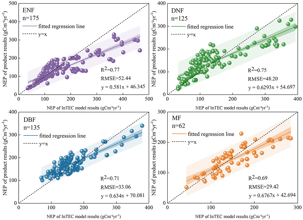 To validate the model, we selected sample plots for the four different forest types from the inventory data and extracted the average NEP values simulated by the InTEC model for the 1999-2019 period. These values were then compared with a global daily NEP simulation data product published by the team of Ju Weimin et al. (Chen et al., 2019; He et al., 2021). This validation dataset was generated using the mechanistic BEPS model at a daily time step, driven by vegetation parameters, remote sensing data, meteorological inputs, and atmospheric CO2 concentrations, covering the period from 1981 to 2019. To ensure temporal consistency, we calculated the mean values from this product for the 1999-2019 validation period. The scatter plot fitting results (Figure 6) show a high degree of correlation between the InTEC model simulations and the validation product for all forest types, with R2 from 0.69 to 0.77 and the RMSE values ranged from 29.42 to 52.44 g C·m−2·yr−1.