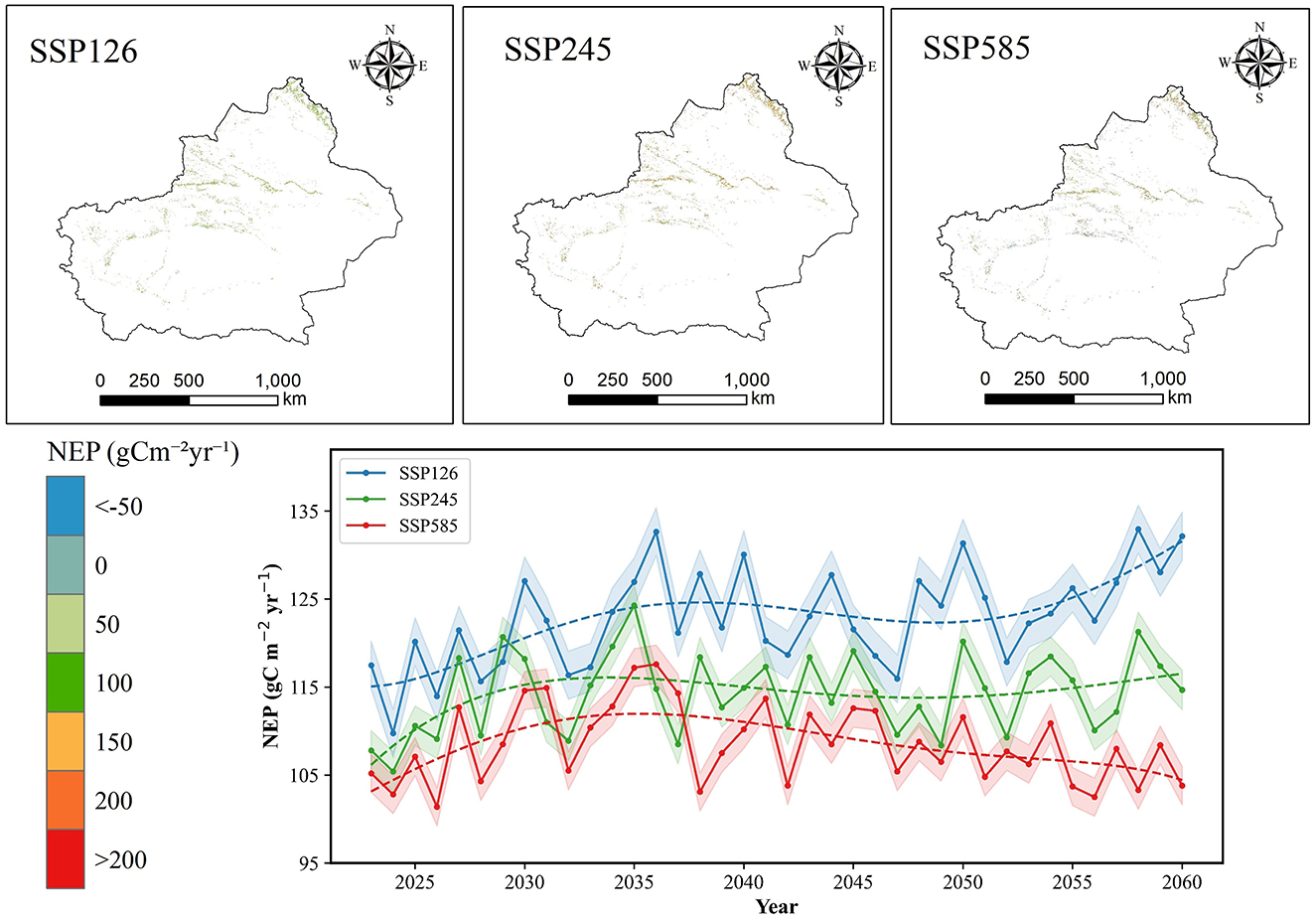 A comparison of future carbon sequestration potential reveals that the capacity under the SSP126 scenario is markedly higher than the others. This suggests that under a low-emission pathway, more moderate warming and stable precipitation patterns would result in weaker water stress on forests, leading to optimal spatial effectiveness of carbon uptake (Pan et al., 2024; Liu et al., 2024) In contrast, under the SSP245 and SSP585 scenarios, the NEP growth rate is expected to decline noticeably after 2045, with some periods even showing a net decrease. This is likely attributable to uncontrolled greenhouse gas emissions leading to more frequent high-temperature events, droughts, and other extremes, which would particularly affect the desert forests of southern Xinjiang and high-altitude coniferous forests. The detrimental impact of high temperatures and drought on forest carbon sink capacity is well-documented. For instance, an extreme temperature event in Qianyanzhou in 2003 caused a 90% reduction in net ecosystem exchange (Zhang et al., 2018), and similar conditions in 2013 reduced forest carbon sequestration in southern China by approximately 100 Tg C (Yuan et al., 2016). Furthermore, as most of Xinjiang's forests are in high-altitude areas with cooler climates, a near-term temperature increase may initially enhance the carbon sink by extending the growing season. However, after 2045, continued warming could push temperatures beyond the optimum for photosynthesis, posing a significant risk of NEP decline (Niu et al., 2024).