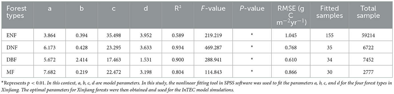 The InTEC model requires NPP-Age curves during its spin-up phase to calibrate the dynamic processes of the forest carbon cycle and to establish the initial state of the carbon and nitrogen pools (Zhang et al., 2012). In this research, we leveraged the 2011 forest age information and the corresponding estimated forest NPP values derived from the forest inventory data. These datasets were used to fit growth curves for the four major forest types in Xinjiang (Table 1), which provided essential parameters for driving the InTEC model (Zan, 2022). The relationship between NPP and stand age is described by Equation 8 (Chen et al., 2002).
