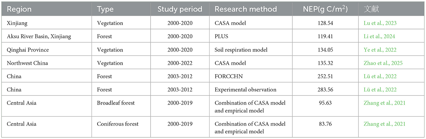 Furthermore, we compared our NEP estimates with those from other scholarly works (Table 2). The mean NEP for Xinjiang's forests in our study was calculated to be 91.56 g C·m−2·yr−1 for the period 2000-2022. Our estimate is generally lower than those from national-scale studies but shows smaller discrepancies when compared with studies focused on the same province or adjacent regions like Central Asia, Northwest China, and Qinghai (Table 1). For instance, Lu et al. (2023), using a modified Carnegie Ames Stanford Approach (CASA) model, estimated the vegetation NEP in Xinjiang to be 128.54 g C·m−2·yr−1 for 2000-2020. Li et al. (2024) simulated the total NEP in the Aksu River Basin for 2000-2020 using the PLUS model and reported a value of 119.41 g C·m−2·yr−1 for forest land. In another study, Zhang et al. (2021) combined the CASA model with an empirical model to estimate NEP in Central Asia from 2000-2019, yielding multi-year averages of 95.63 g C·m−2·yr−1 for broadleaf forests and 83.76 g C·m−2·yr−1 for coniferous forests. The mean value from our model simulation falls comfortably within the range of these high and low estimates. This comparative analysis suggests that the results from our application of the InTEC model reasonably reflect the forest carbon sink at a regional scale in Xinjiang, with simulation errors maintained within an acceptable range. This confirms the InTEC model's capability to accurately capture and represent the spatiotemporal characteristics of NEP in Xinjiang's forests.