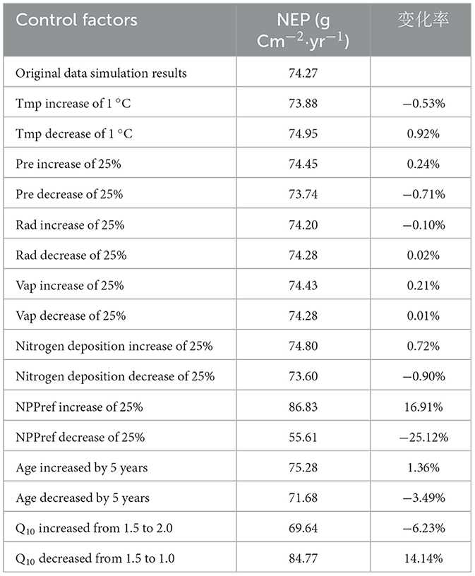 Sensitivity analysis was conducted to quantitatively assess the influence of model parameters and input data on the simulation results. In this study, we employed a one-at-a-time approach, where individual parameters or input variables were systematically altered while holding others constant. The resulting changes in simulated NEP were then compared against the baseline simulation to evaluate the model's sensitivity. To assess this, temperature was adjusted by ±1 °C, while precipitation, radiation, and vapor pressure were altered by ± 25%. The InTEC model was then run with each of these modified inputs, and the resulting changes in simulated NEP were analyzed (Table 3). Furthermore, we performed a sensitivity analysis on several key inputs: nitrogen deposition, reference year NPP (NPPref), forest age (age), and the temperature sensitivity coefficient of respiration (Q10). The temperature sensitivity coefficient for respiration, Q10, plays a key role in autotrophic respiration calculations. Studies have shown that the typical value of Q10 is around 1.5, but it can vary significantly under different ecosystem and soil conditions. In arid or wet environments, Q10 may reach values above 2.8 or below 1.2, respectively (Meyer et al., 2018). Q10 is calculated using the definition formula (Reichstein et al., 2000) (Equation 9):