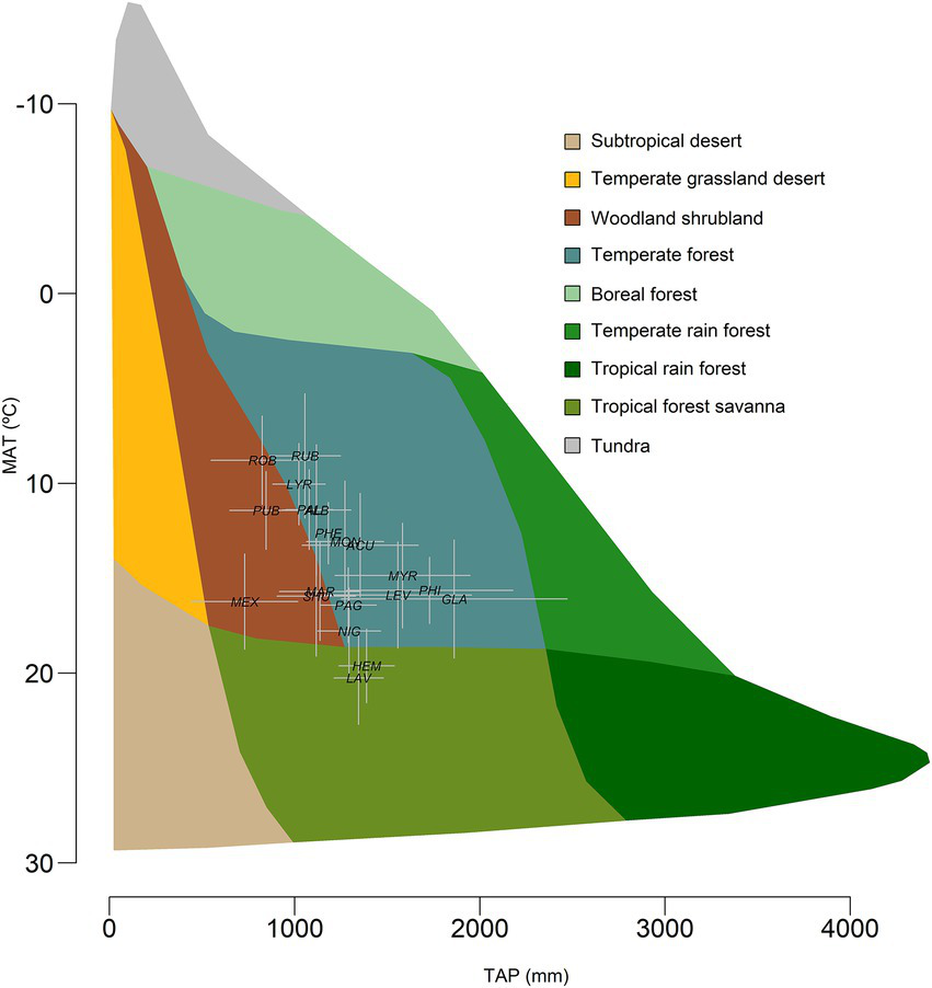 The average climate conditions and additional bioclimatic variables (19 bioclimatic variables; see Supplementary Table S2) were obtained for each site from WorldClim database.3 The bioclimatic variables are derived from monthly temperature and precipitation records and provide information on climate annual trends, seasonality, and extremes (Fick and Hijmans, 2017; Hijmans et al., 2005). We used the moderate resolution global data (2.5 min) to represent the bioclimatic conditions for each species occurrence. Additionally, mean values were calculated for each bioclimatic variable across species to represent the bioclimatic distribution for the species (Figure 1).